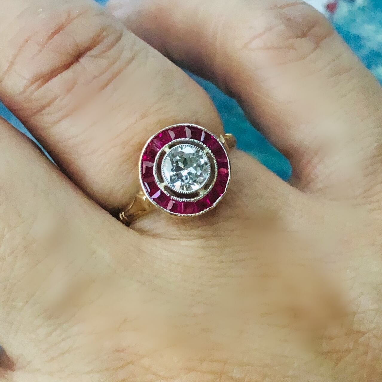 ダーツのターゲットに似ている事からターゲットリングなどと呼ばれる事もあるオールドヨーロピアンカットダイヤモンドの周りをルビーで囲んだリングです。周りを囲むカリブレカットされたルビーは一粒一粒丁寧に金の枠に擦り合わせて合わせてカットしてあり、小粒のルビーでまるで描かれた一本の太い赤いラインの様に見える事が特徴とも言えます。真ん中の大粒のオールドヨーロピアンカットのダイヤモンドはその白さを表現する為に白いプラチナにミル打ちを施してセットされ、まるで赤い円の中に浮かぶ白い的の様になっています。身につけているとラッキーな事が起こりそうな赤いルビーと白いダイヤモンドのリング。プラチナとゴールドのコンビネーションも身につけやすく現代のジュエリーや時計とのコーディネートもしやすいと思います。肉眼でわかりませんが、インクルージョンが拡大画像の様に入っています。