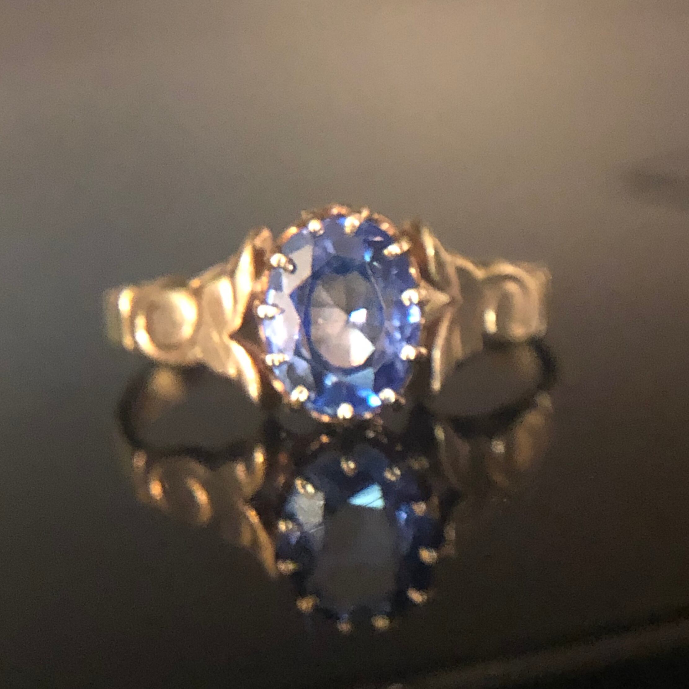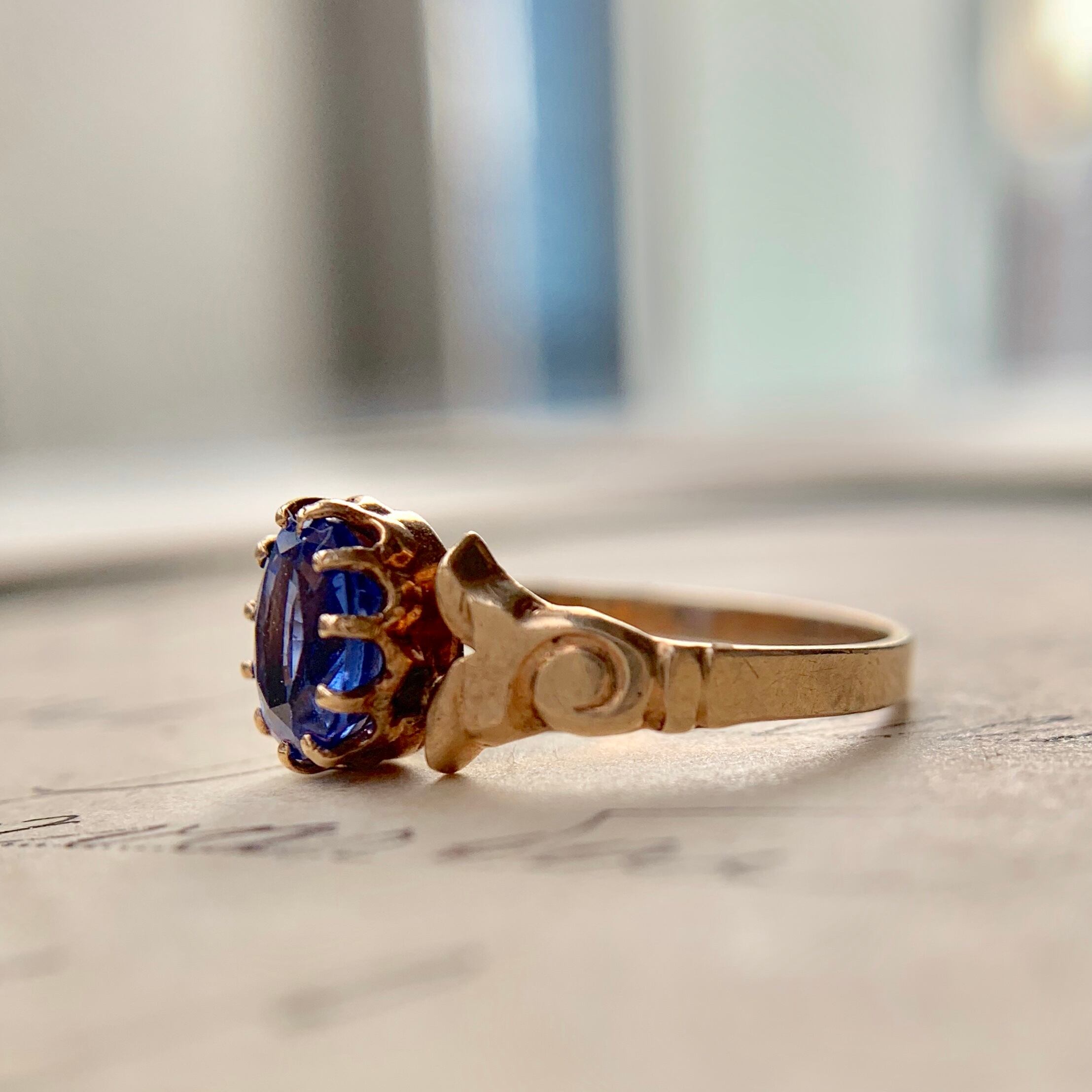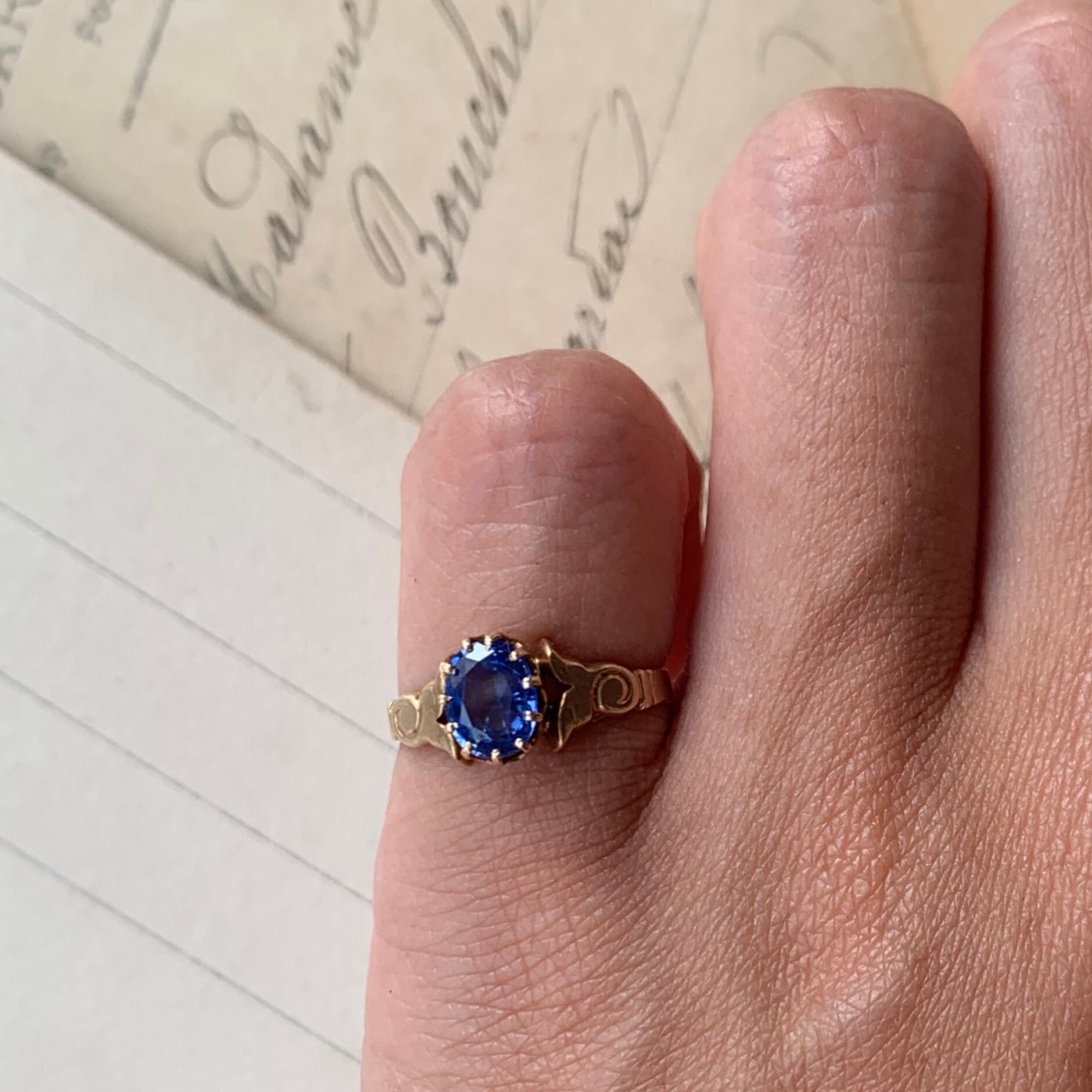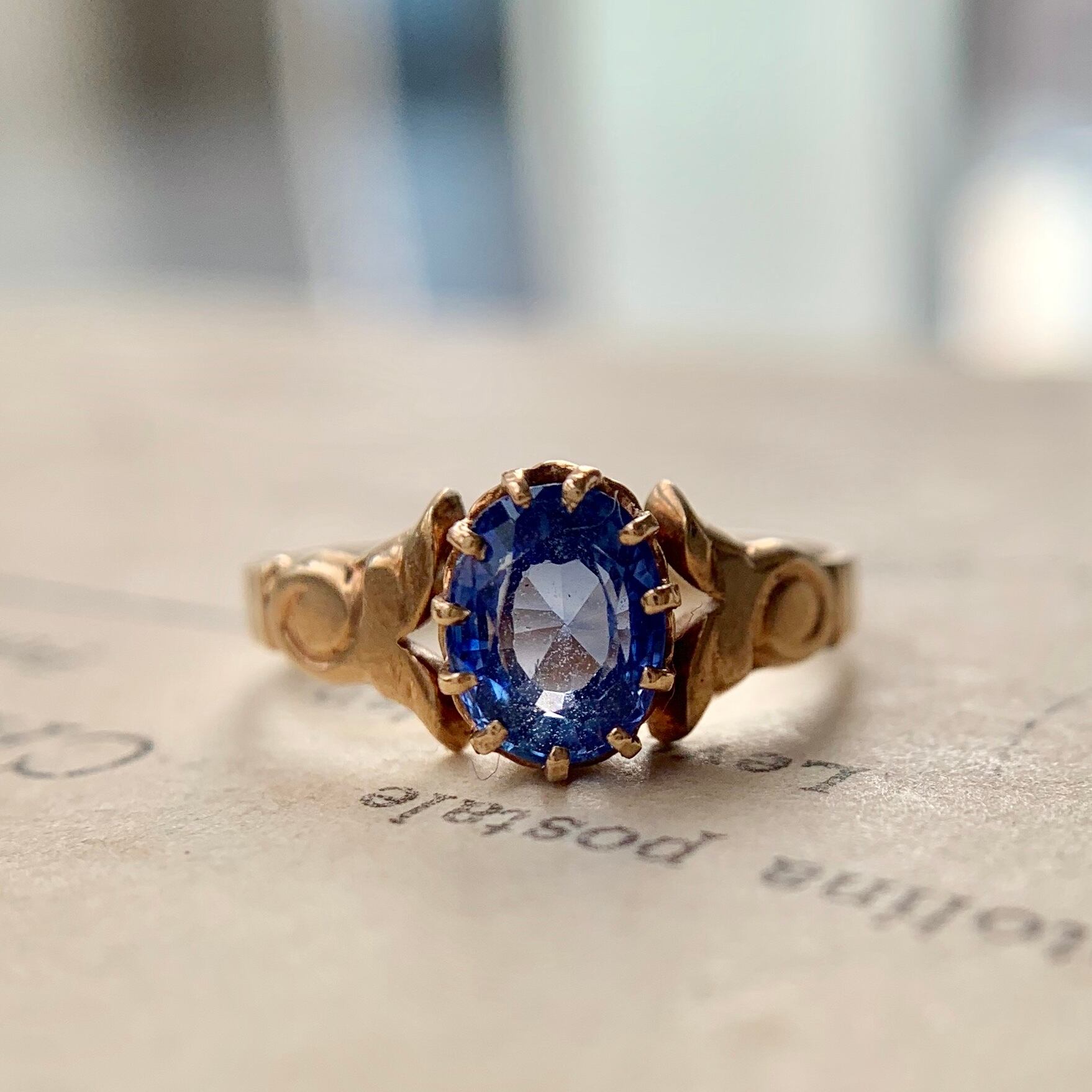 サファイアのアンティークゴールドのピンキーリングです。少し薄めの色のサファイアですが、写真を見て頂くとわかる様にリングに指を通して頂くとちょうど良い濃さの美しいサファイアになります。(着用写真は自然光で撮影) 正直ピンキーにはちょっと贅沢かも?と思うような大きさのサファイアが使ってあるのでサイズをアップして他の指にしても素敵です。シンプルなデザインですが一粒のサファイアが引き立ってとても綺麗でつけやすいリングです。
