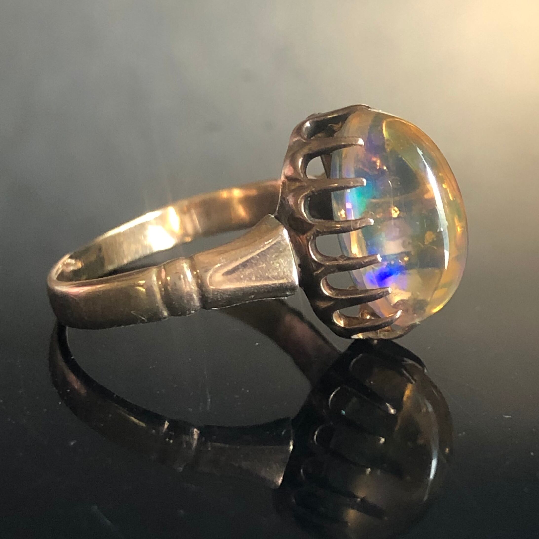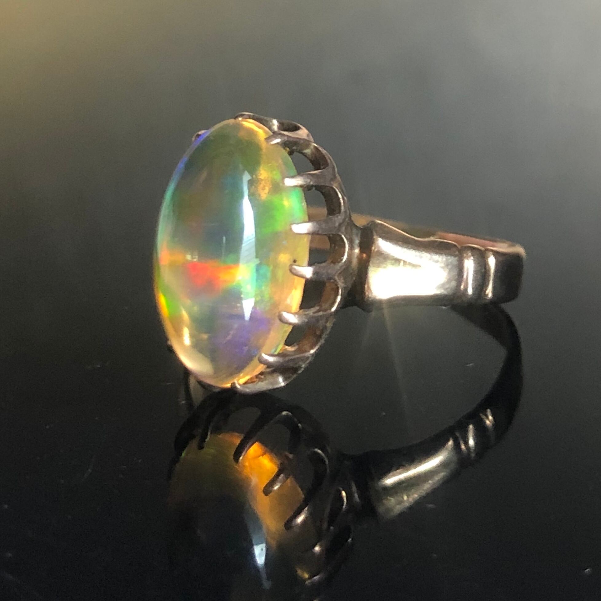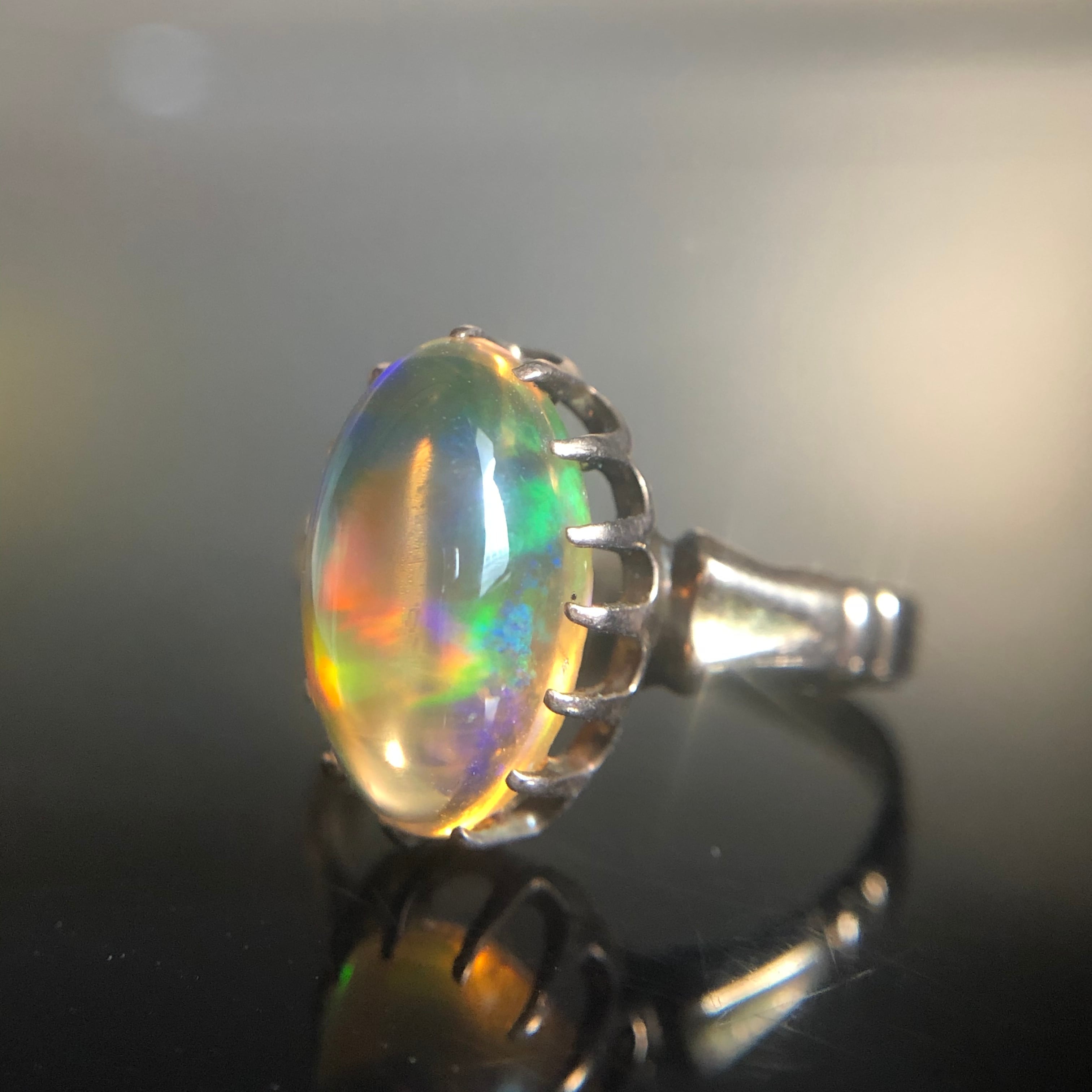 まるで石の中に様々な色の熱帯魚が泳いでいるかの様な美しいオパールのアンティークリングです。オパールには遊色効果、英語でPlay of Colour と呼ばれる美しい色がまるで遊ぶように動きと光によって現れる光学効果がありこれは表面に近い結晶の層状構造によって干渉光が反射し、虹のような多色の色彩を示す現象がありますがこのリングは本当に身に着けていて次々と現れる美しい色に心浮き立つリングと言えます。シンプルなアンティークジュエリーならではの細かな爪留めもこの美しい石を引き立ててくれています。