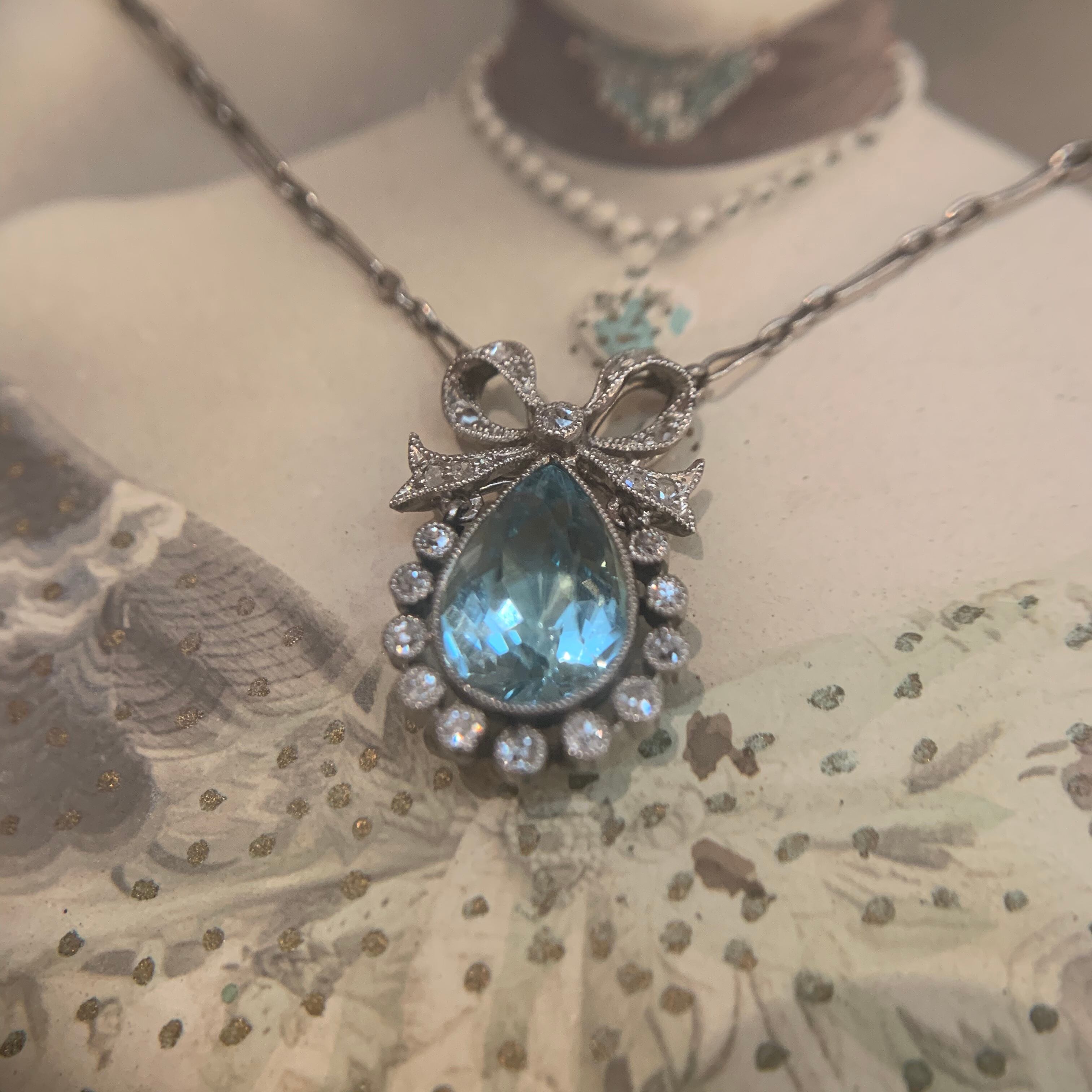 1900年ごろに制作されたと思われる美しいドロップ型のアクアマリンとダイヤモンドのリボンのペンダントです。繊細なハンドメイドのプラチナワイヤーのチェーンがアクアマリンの透明感を一層引き立てています。細かなディテールのオールドカットダイヤモンドのリボンにはミル打ちが施されため息が出るような美しいバランスのペンダントです。このペンダントに使われているアクアマリンはそれほど大きな物ではありませんが、アクアマリンの中では最高級と言われる濃い色のブラジルのサンタマリアの物だと思われます。デザイン、細工と共に本当に完成度の高い美しいペンダントです。