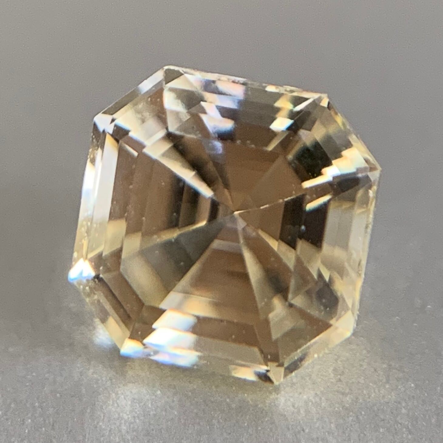 この美しいサファイアの色合いを更に引き出しているのがアッシャー社のアイコンであるロイヤルアッシャーカット。ダイヤモンドのカッティングで培われた精緻な研磨技術が生み出す光と色彩のモザイクは他のカットとは一線を画し、その絵画的な美しさにファインダー越しにうっとりとして思わず売れなくても良いかな?と思ってしまいます。淡いイエローのボディーカラーですが、それが却ってロイヤルアッシャーカット特有のモザイクのドラマチックなコントラストを引き立てています。その美しさと存在感は本当にロイヤルの称号にふさわしいお品です。