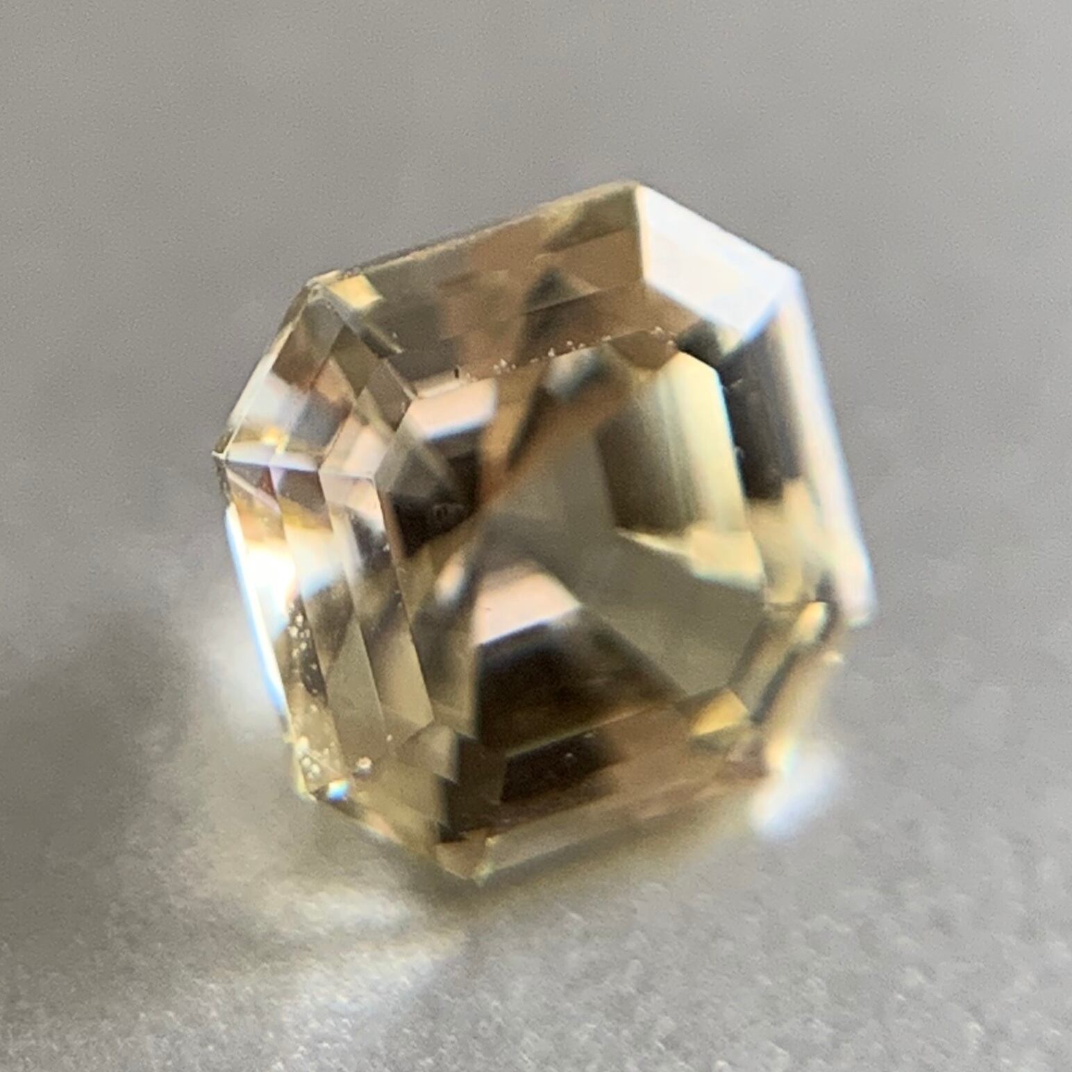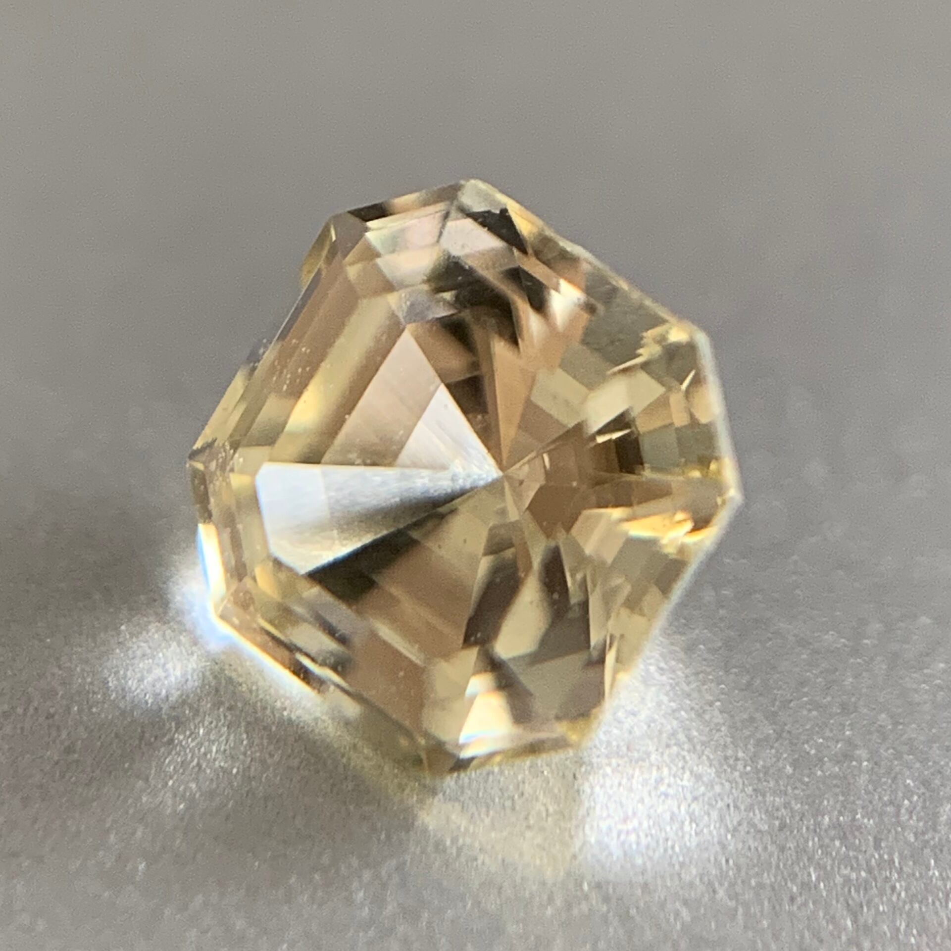 柔らかなイエローのサファイアはロイヤルアッシャー社特有の美しいカットで独特の光を放ちまるでイエローダイヤモンドの様なキラリとした光を放ちます。