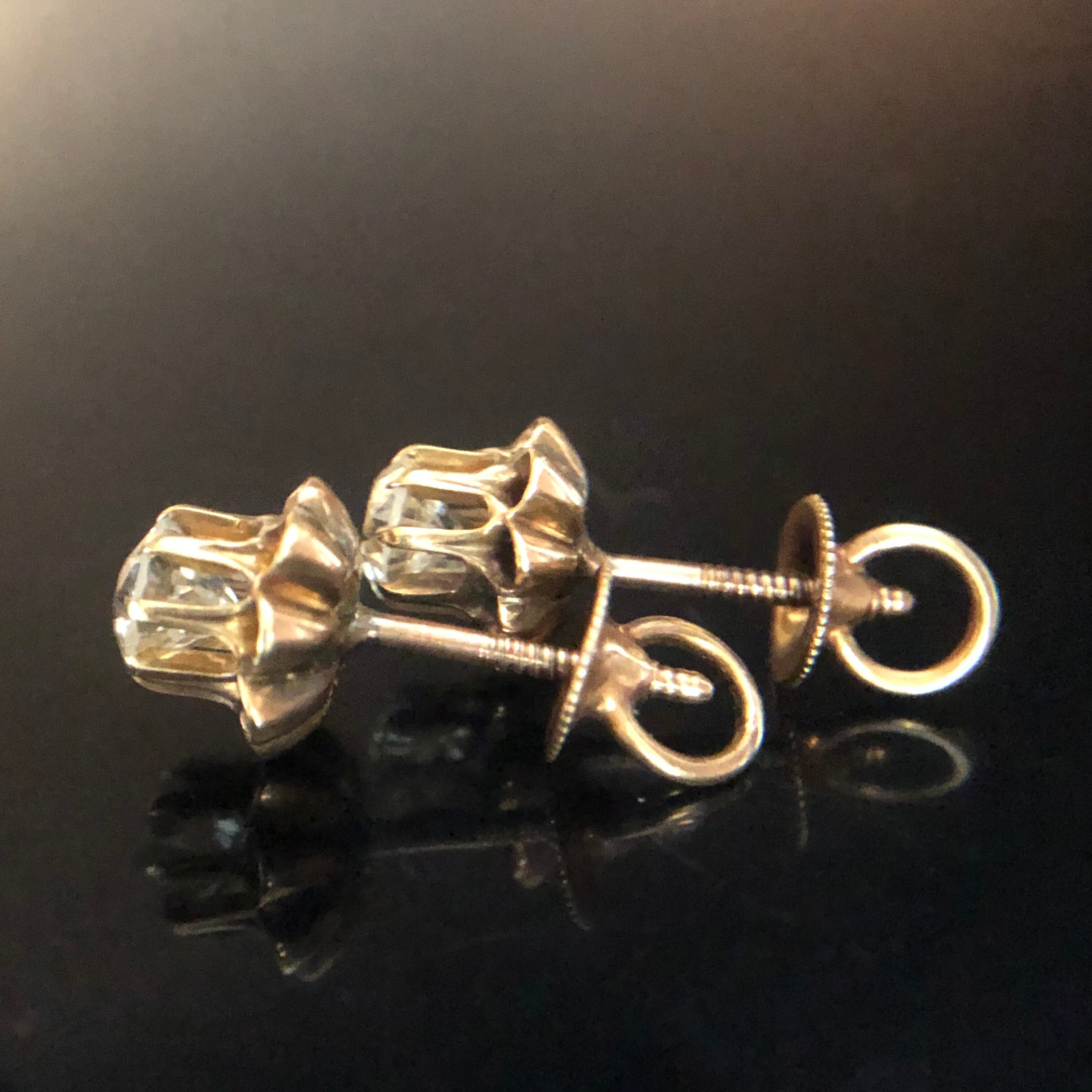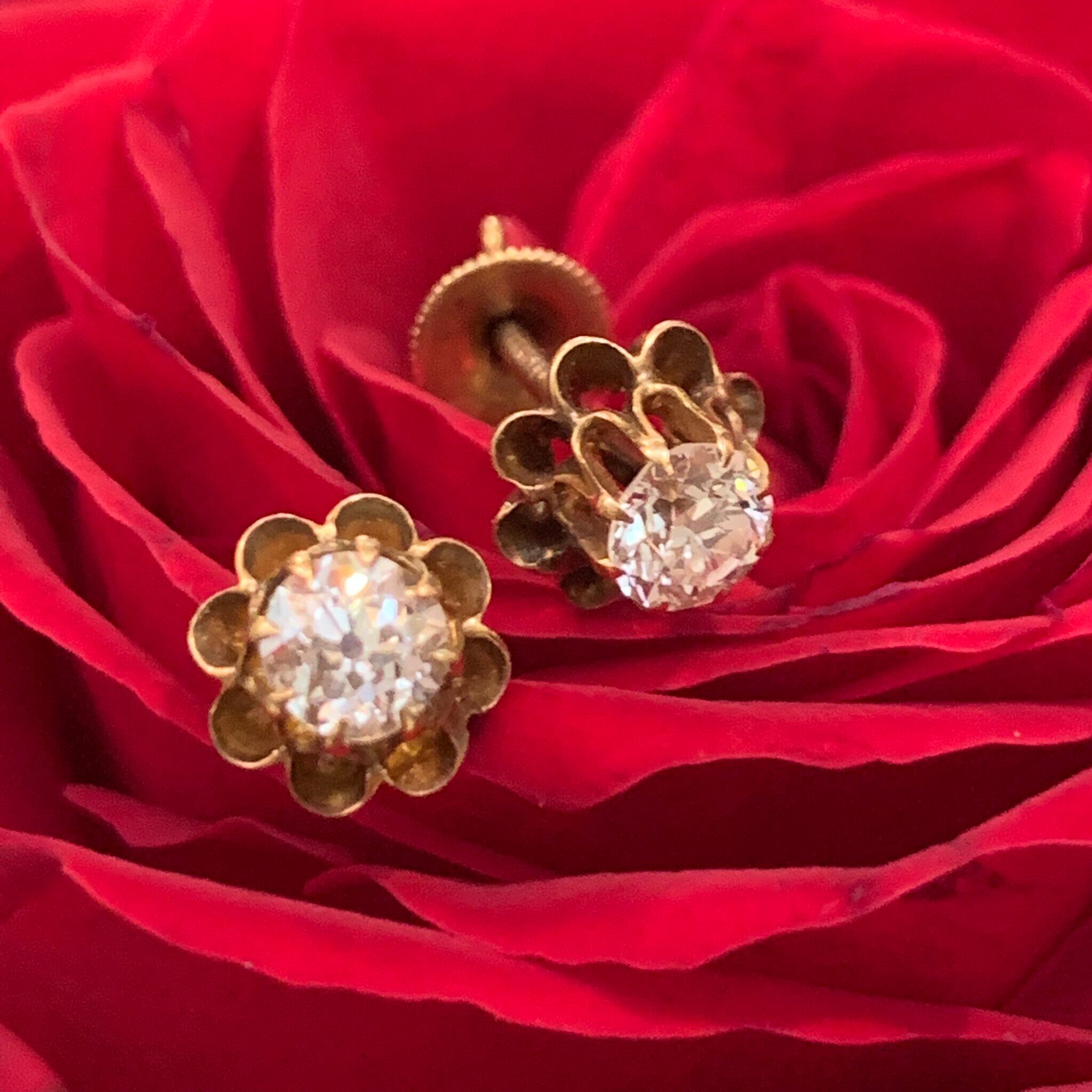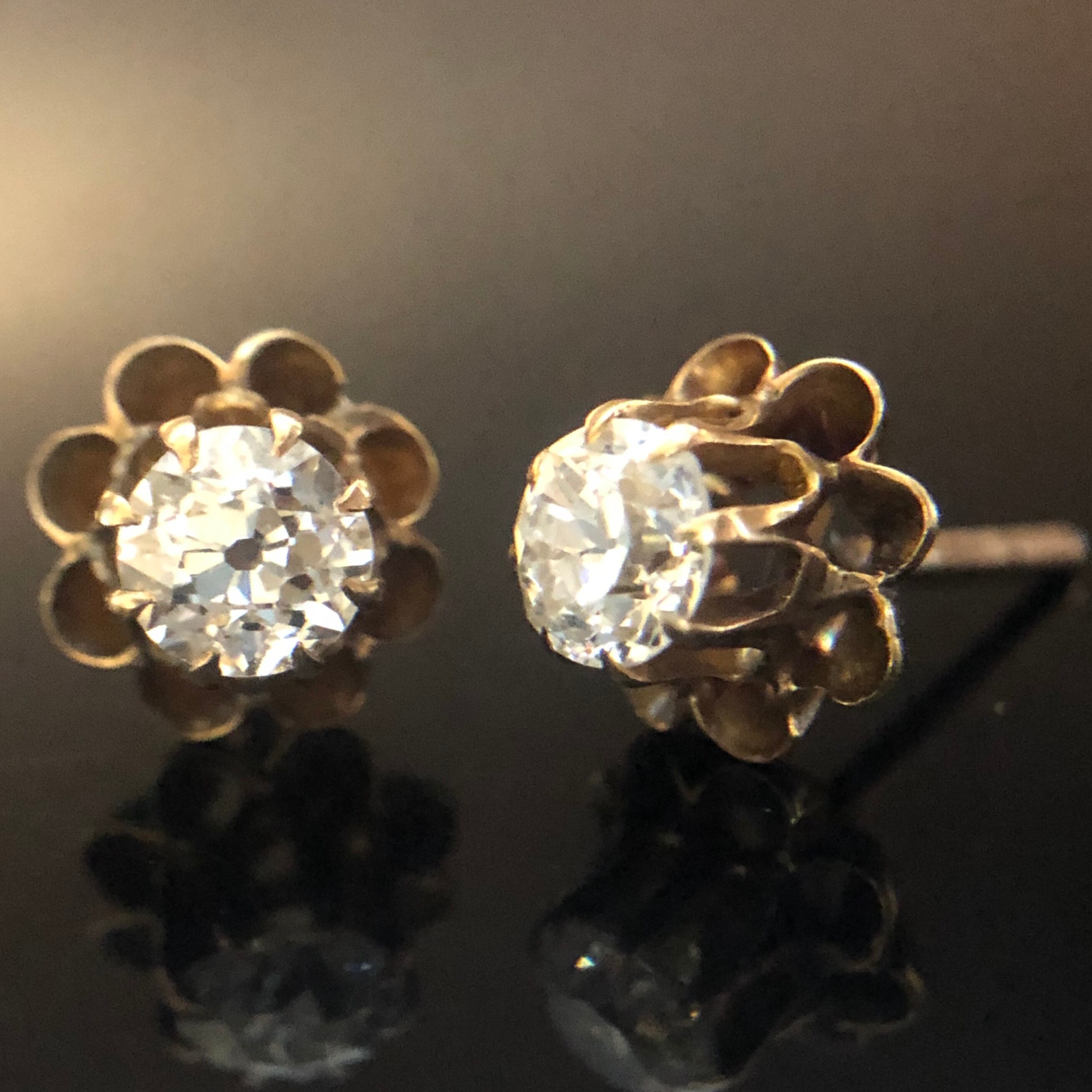 ゴールドの金鳳花の花をモチーフにデザインされたバターカップセッティングに良質なオールドカットダイヤモンドがセットされたピアスです。金具も全てオリジナル金具でスクリュー(ネジ式)になっている為落ちる事がありません。完全に金具までオリジナルのスクリュー式のアンティークのスタッドピアスはなかなか見つからないお品。ダイヤモンドの大きさも約トータルで1.1ctほどあり、少し贅沢な普段使いにもお勧めです。1880年から1900年ごろに作られたお品だと思われます。