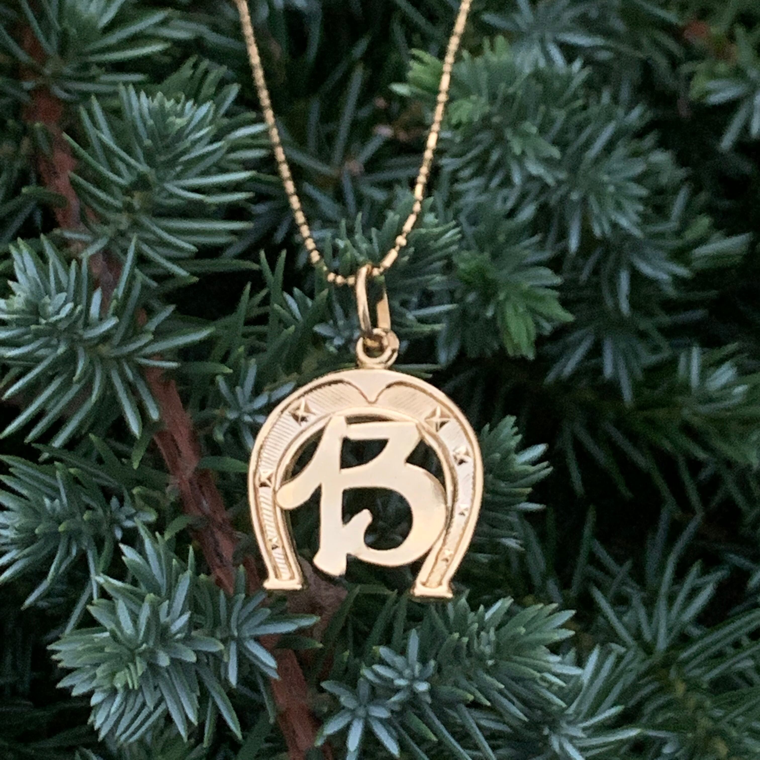 その13番に馬の蹄鉄を組み合わせたペンダントチャームにアジャスター付きのネックレスを付けています。13と言うと西洋では13は不吉な数字として敬遠されているというのが通説ですが、逆に魔除けとして自分に陰を寄せ付けない意味を込めて身につける習慣がありヨーロッパやアメリカではラッキーアイテムとしてコレクションをされている方の多いアイテムです。