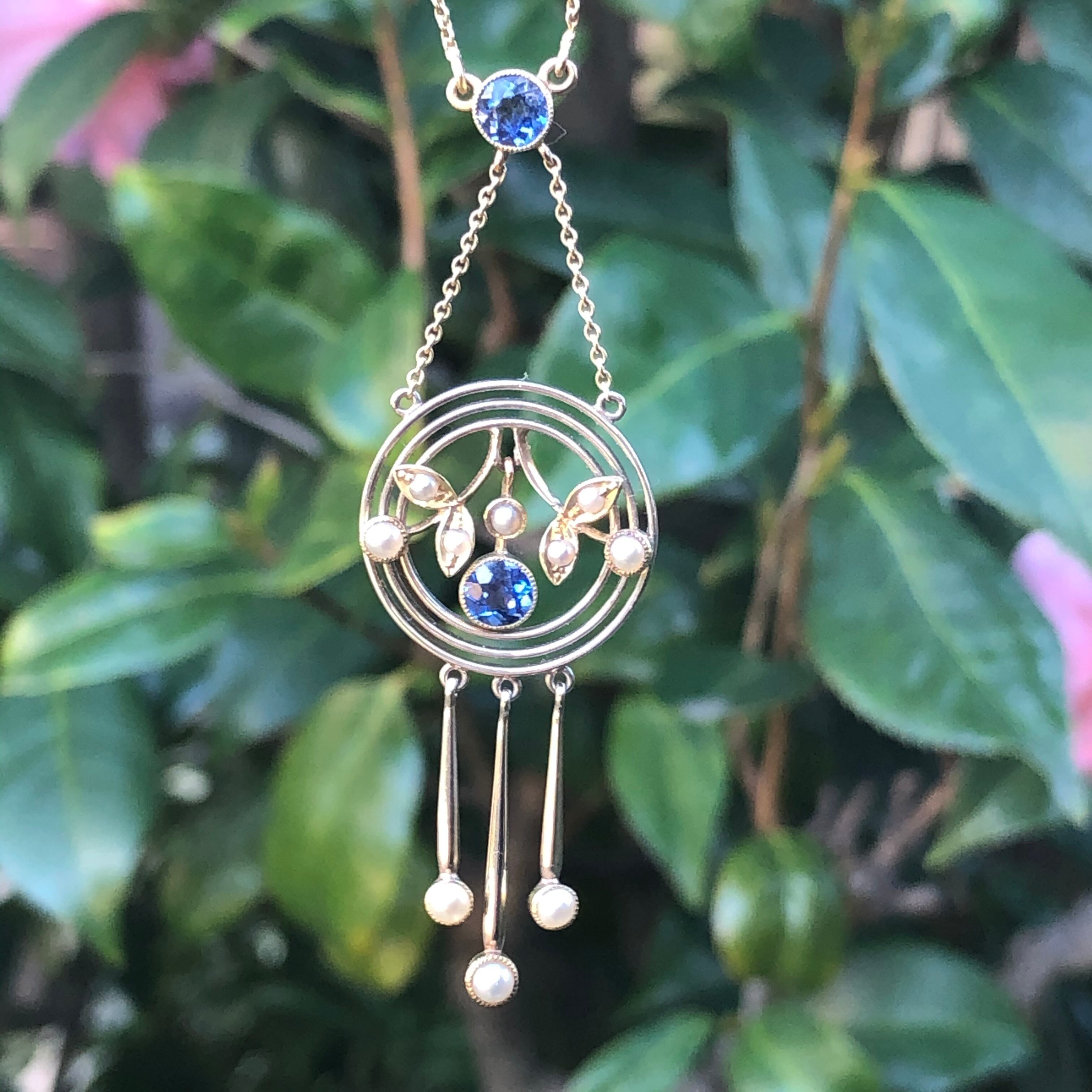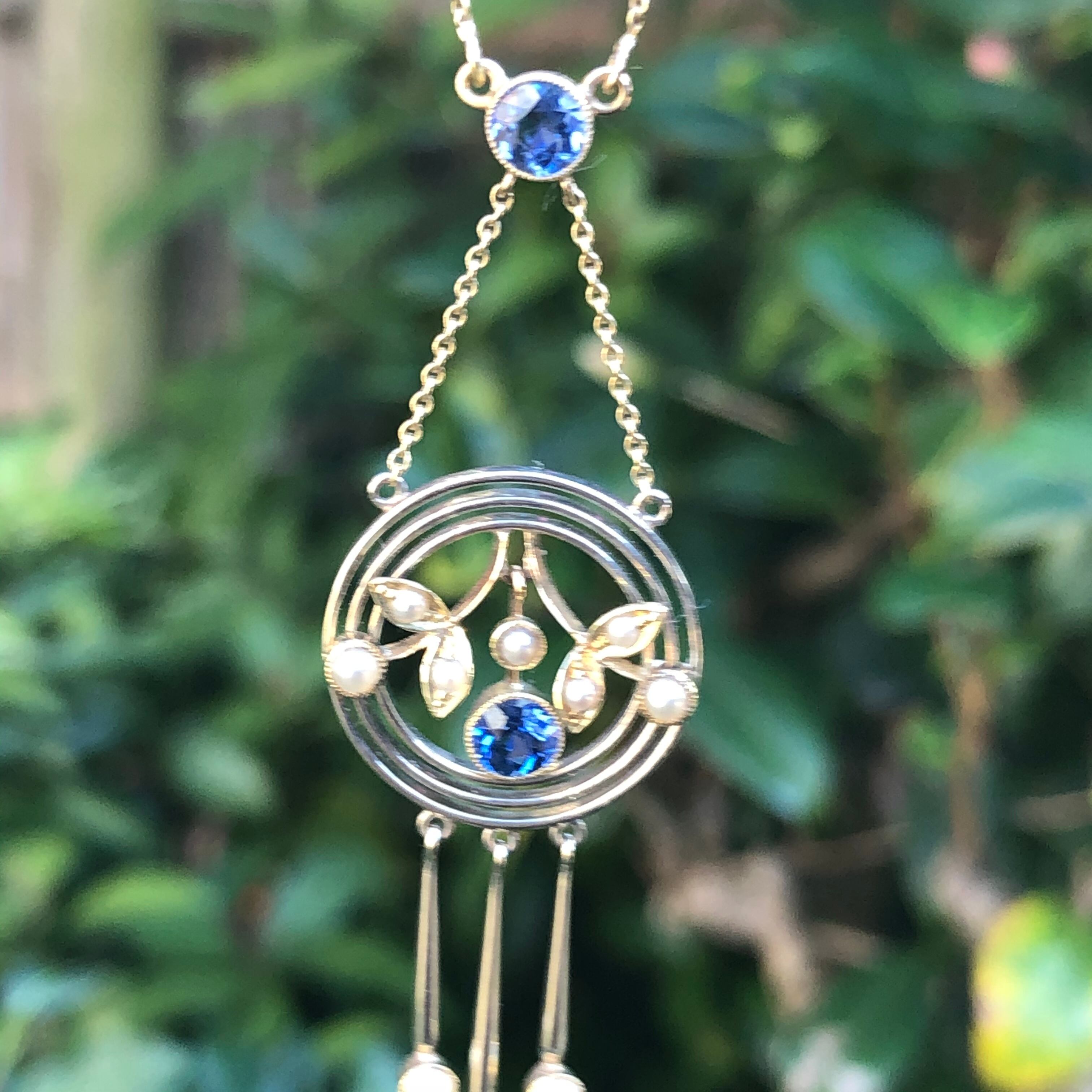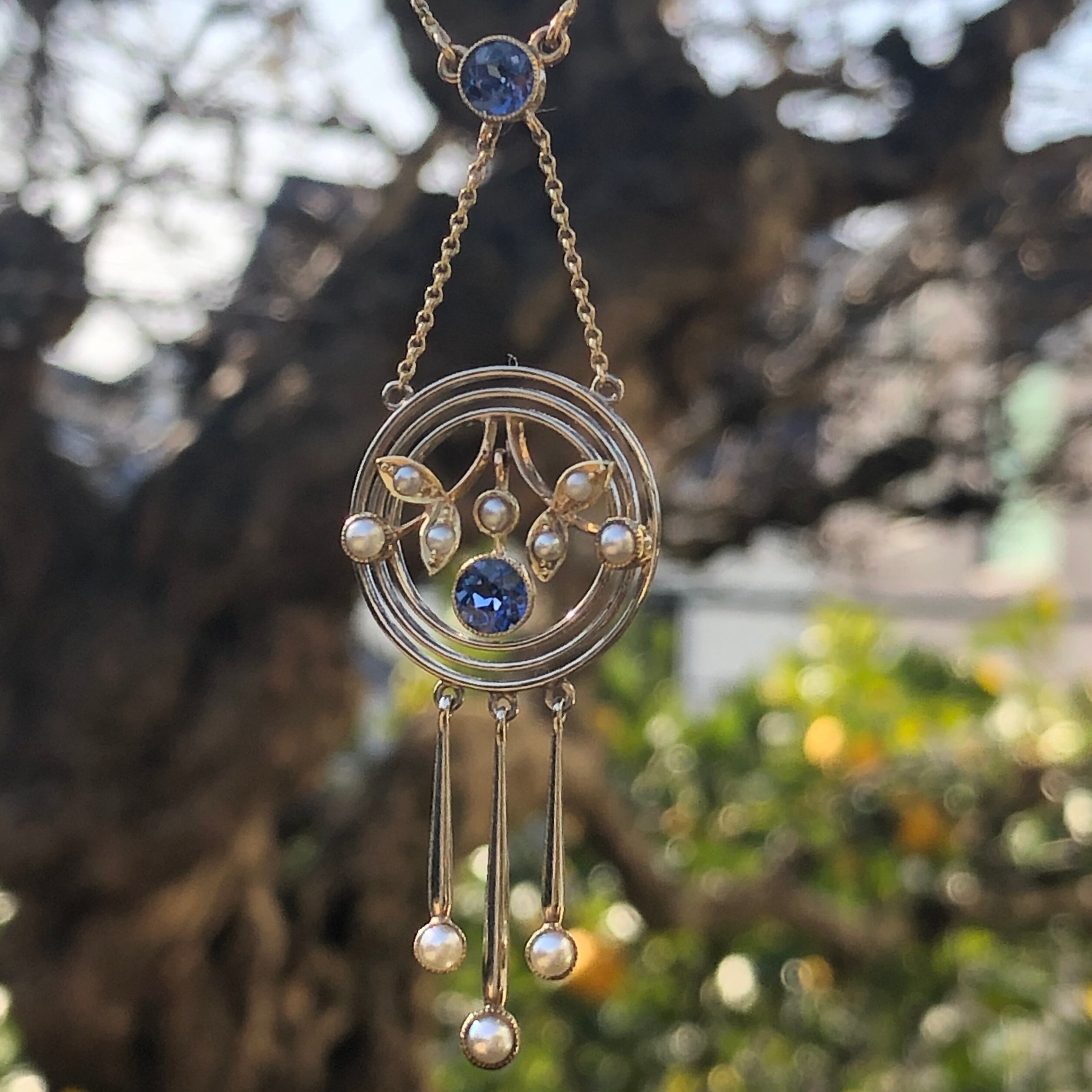 そんな美しいモンタナサファイア約0.35ctが2ピース、ゴールドのミル打を施され、小粒の天然真珠と一緒に揺れるペンダントに仕立てられています。ターンオブザセンチュリー、20世紀の始めのアール・デコの影響のでたその完成された形とデザイン、完璧な作り、身につけると動きに合わせてエレガントに動く下のサファイアや3つのシードパールのドロップ。もともとそのサファイアの美しさに惹かれてピアスにしても良いかもしれないと思い仕入れたペンダントですが