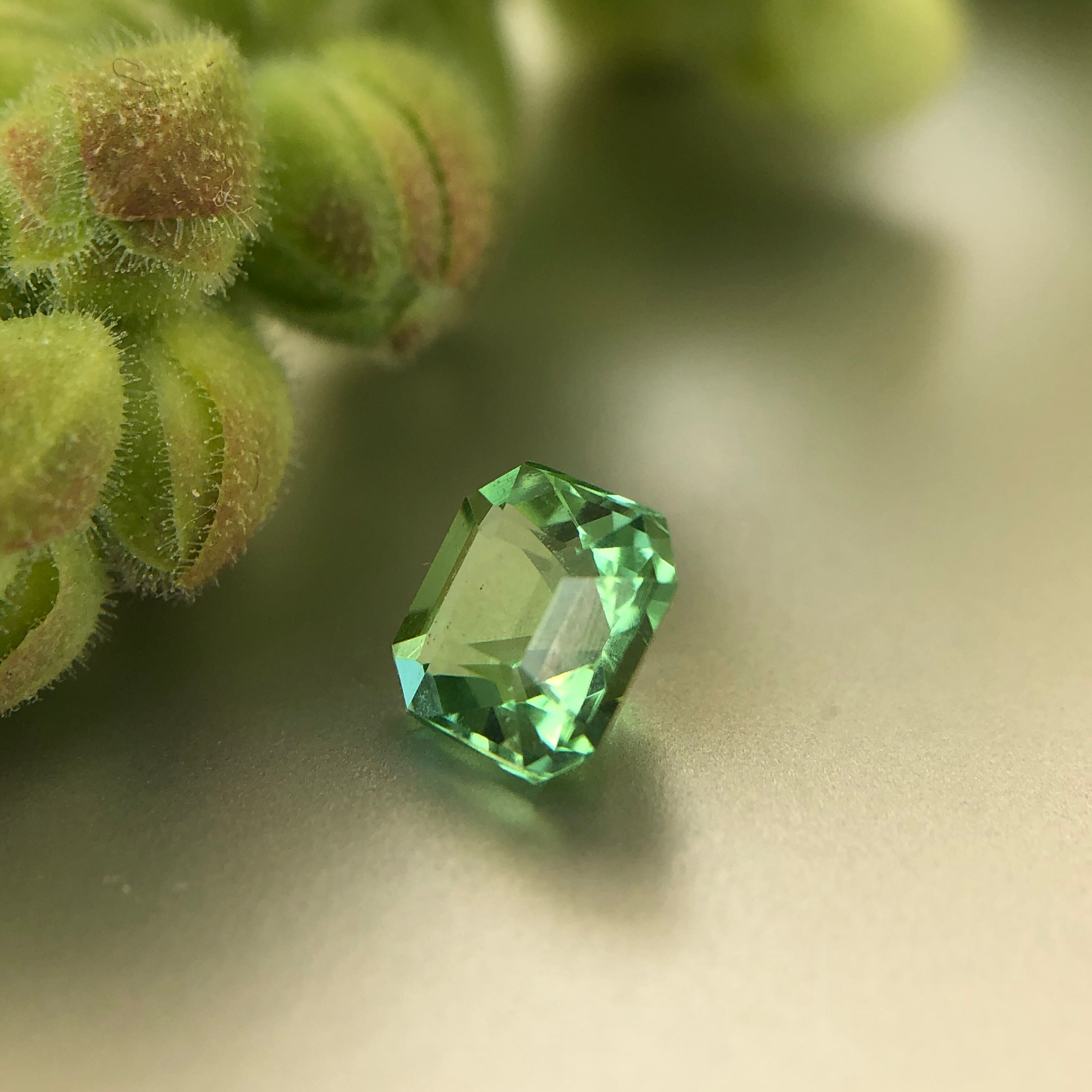 1.38ctの日本ではまだあまり知られていない鉱山の非加熱トルマリンです。原石を分けて貰いい1番美しく見える深めのアッシャーカットにして見ました。まだどのくらいの産出が調査出来ていませんがブームが来て高くならないうちに私も少し手元に置いておきたいと思うくらい魅力的な石であることは間違いありません。この産地で採れるトルマリンにはブルー、グリーン、オレンジ、ホットピンク、など色々な色がありますが、この2.34ctのトルマリンは特にトルマリン界の”デマントイドガーネット“と呼んでも良いのでは?と思うくらいまるで発光しているかの様な華やかな黄緑色が美しいガーネットです。