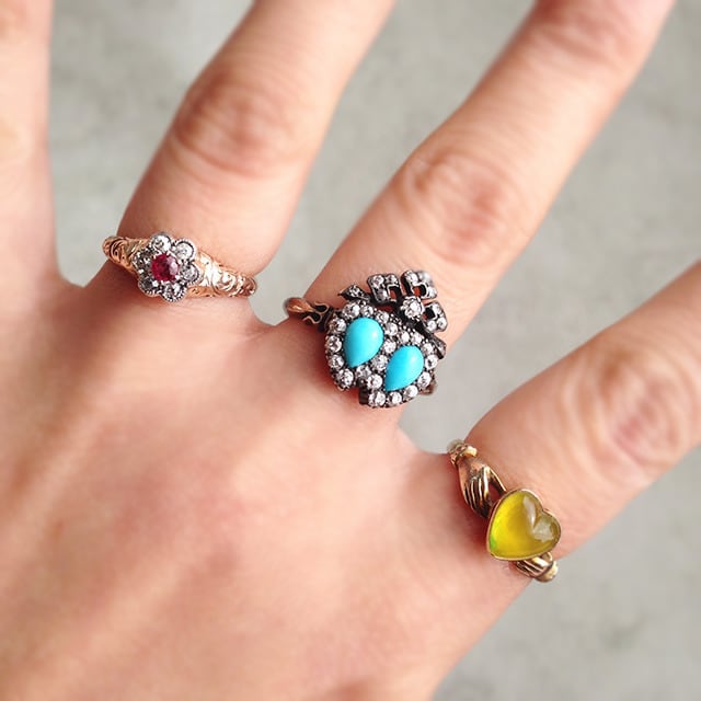 レースのひだを表現したようなカフの部分の彫り模様やぷっくりとしためのうのハートも愛らしく、アンティークならではの豊かな物語を感じさせてくれるリングです。