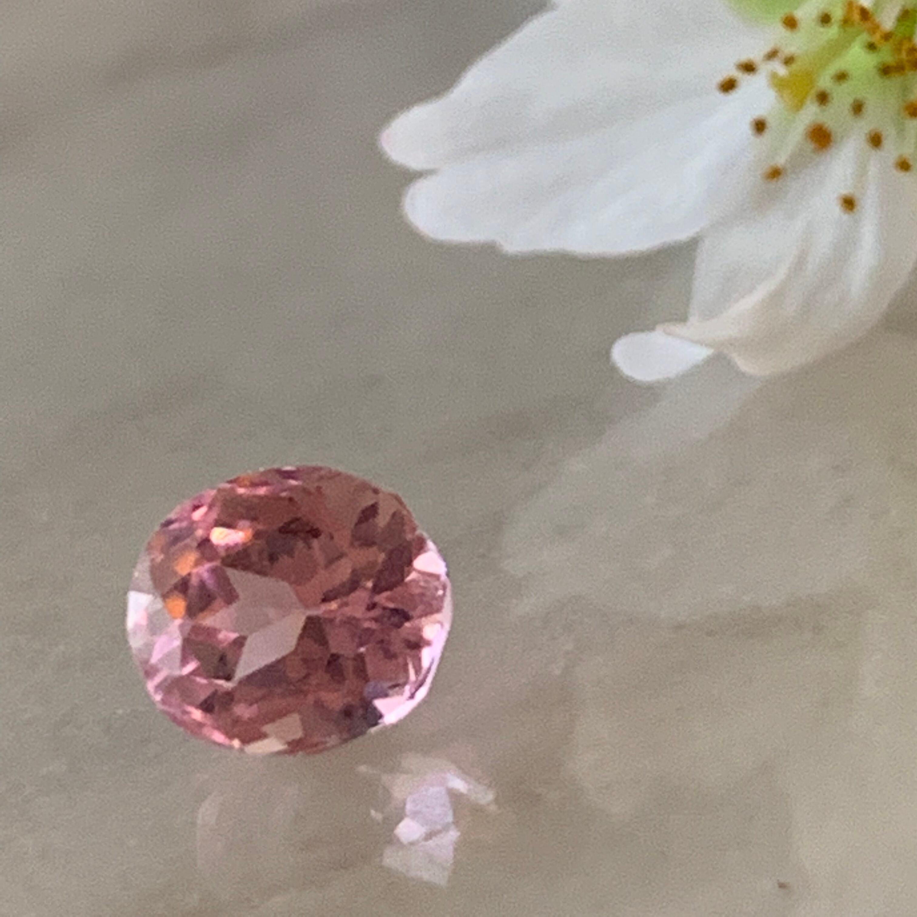 満開の八重桜色に時々チラリとオレンジ色がのぞくピンク色のトルマリン。1.79ctのまだあまり日本では知られていない鉱山の非加熱トルマリンです。この産地で採れるトルマリンにはブルーグリーン、オレンジ、ホットピンク、など色々な色がありますが、この1.79ctのトルマリンは原石を分けて貰い1番美しく見える少し深めのオーバルカットにして見ました。エレガントで高貴な色で時々昼間の光で見ると八重桜色にチラチラとオレンジの光が覗く様な本当に魅力的な石です。比較的使いやすいオーバルのカットは大きさも程よく小さなダイヤモンドを合わせてペンダントやリングなどにしても本当に美しい色が楽しめると思います。しっかりと全体に色がのったバランスの良い石です。写真ではお伝えしきれないくらい美しく満開の八重桜とオレンジピーチが香る様な色合いです。
