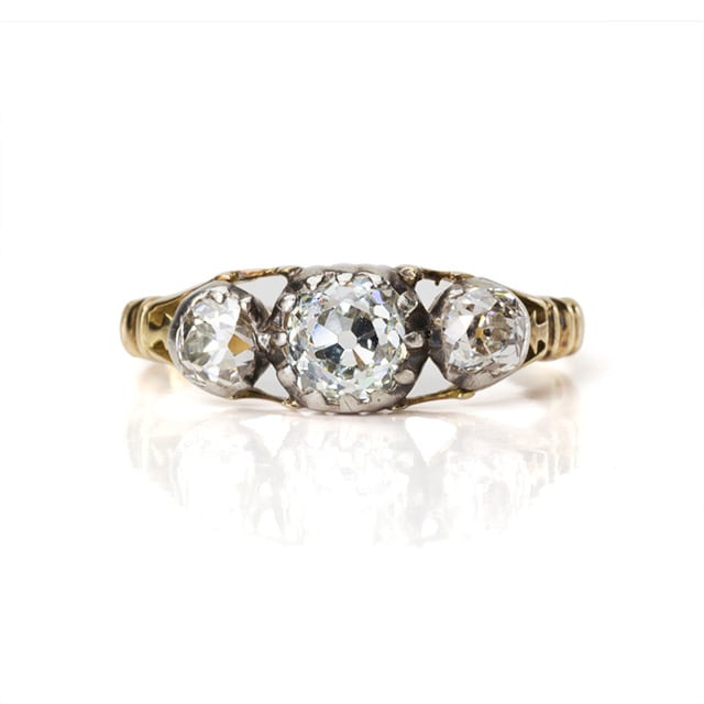 久しぶりに手に入った美しいジョージアンのスリーストーンリングです。18世紀後半のジョージ王朝時代のイギリスで作られたと思われ、この時代特有の茶巾状のセッティングで留められた”ころり”とした厚みのあるオールドマインカットダイヤモンドが放つ白い水しぶきのような瑞々しい輝きがとにかく印象的。肉眼では殆どインクルージョン(内包物)が見えない高い透明度の上質な石が使われています。