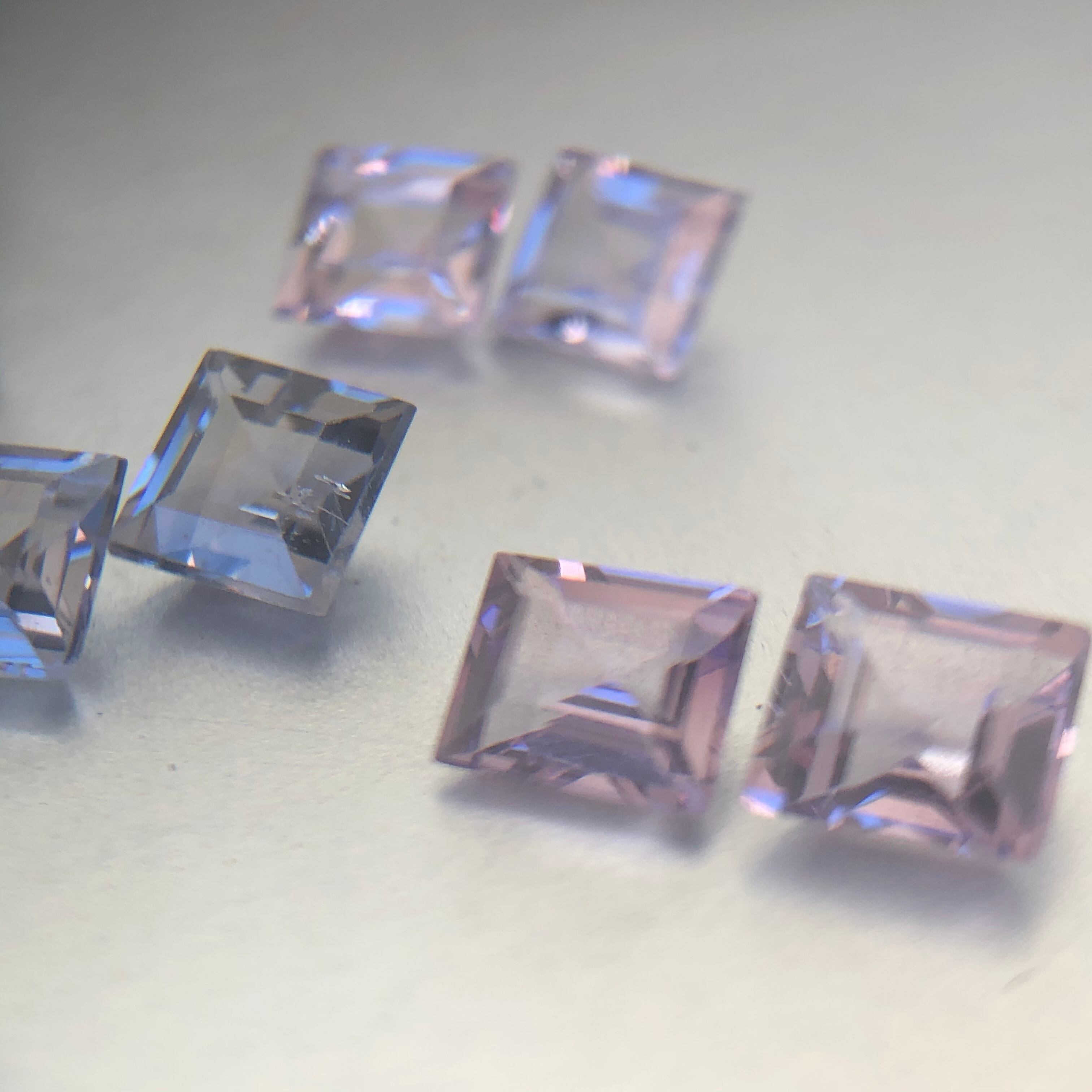 アールデコのアンティークジュエリーに良く使われる形のスクエアのシンプルなカット。ダイヤモンドや色石のリングのアクセントとしても良く使われていて、このカットのスピネルを見た途端にいつかアンティークスタイルのリングか贅沢にブレスレットにしようと思っていたスピネルのコレクションです。その中から同じ菫色のペア石と、形は同じだけれど少し違う色の菫色の石をペアにしています。事前に職人さんとピアスへの加工の金額もリーズナブルにプラスで金もプラチナも18000円程度と言う事で交渉も済ませたので加工がご希望の方はお問い合わせください。このタイプのスクエアのカットは最もインクルージョンなどが目立ちやすいのですがこれはとても綺麗です。どれも本当に綺麗で大きさも3.5から4ミリくらいの使いやすい大きさです。今回はトルコで作られたウズベキスタンの手織りのイカットのポーチに入れてお届け致します。どの石が届くかわかりませんがどれも本当に綺麗です。