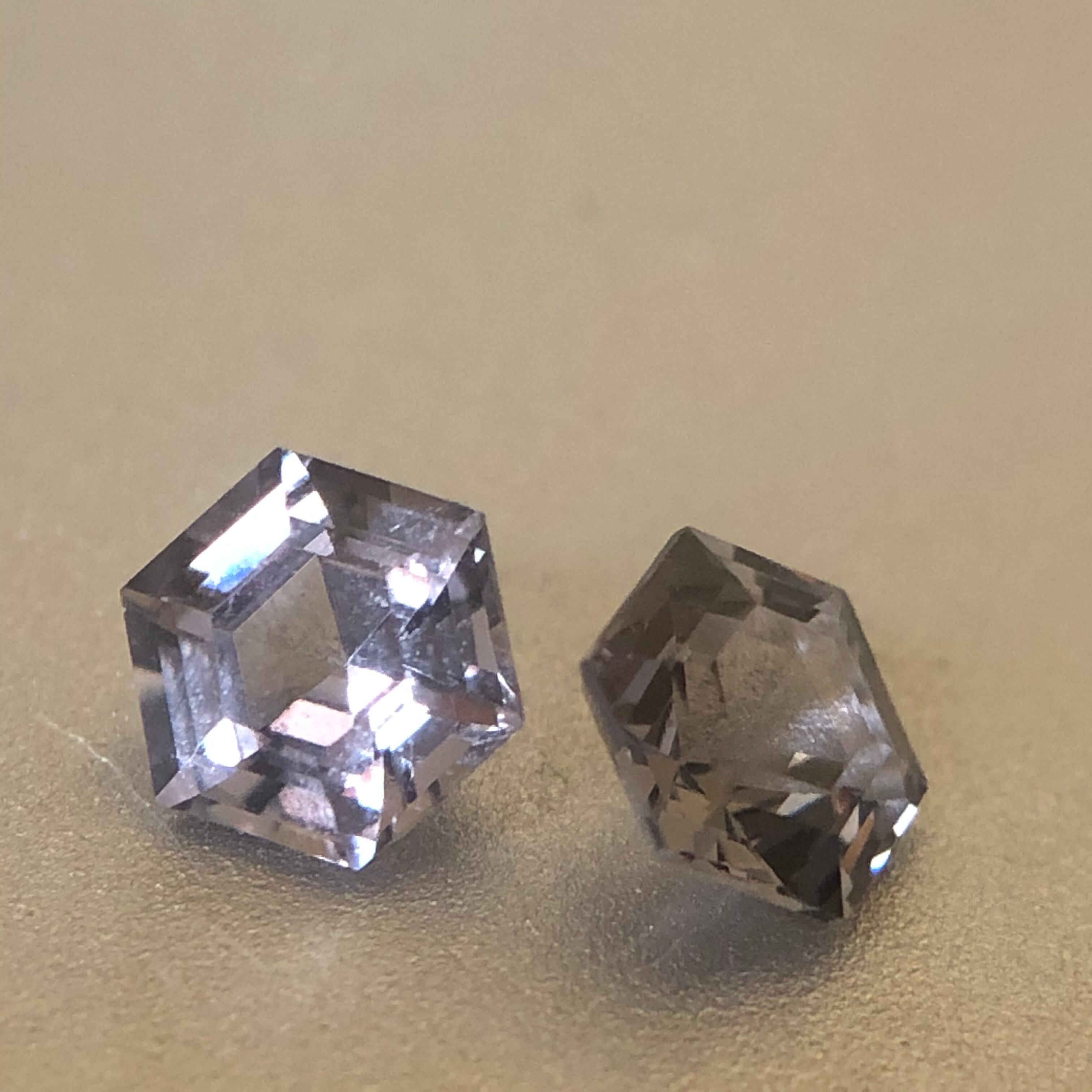少しグレーのかかった菫色のスピネルのペアです。上品な落ち着いた菫色を和風にしたような落ち着いた魅力的な紫色です。勝手にこの8角形をアッシャーカットの次に流行らせたいと思っていますが、もうこのカットの大変なことと言ったら。。。。それでもこのロックダウンの間にかなり練習させ鍛えてこのように美しいヘキサゴナルのピシッとした形を完成。本当に完璧と言っても過言でない形を日本でご紹介したいと思います。どれだけ現地のスピネルの鉱山主やカッターさんが私やオーナーさんに厳しく指導し、言われたのか、この石を手にしていただければお分かりになると思います。ピアスに仕立てても、ダイヤモンドや色石のリングの脇石としてお使いになって頂いても、また個別にご希望があれば他の色をミックスして使いハーフフープリングやエタニティーリングの製作も可能です。