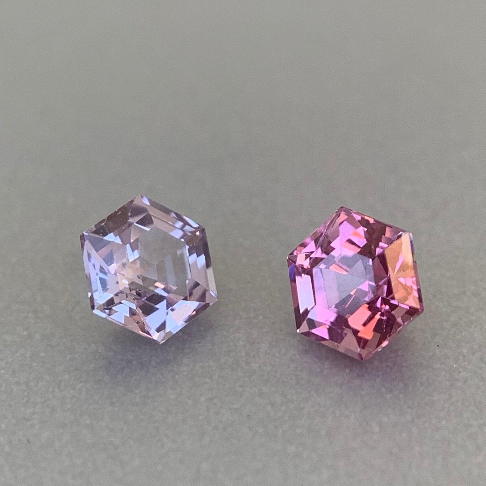 日本ではあまり一般的でないものの海外では色や形違いの石を左右のペアとしてピアスにするのが流行しています。こちらの美しい8角形のスピネルは 肉眼で見るとWow ! と思うくらい美しいホットピンクと白に近い薄いラベンダーピンクでまるで紅白のペアに見える8角形のスピネルです。正直あまりにも美しく手放してしまうのが惜しくて手元に置いていたスピネルです。