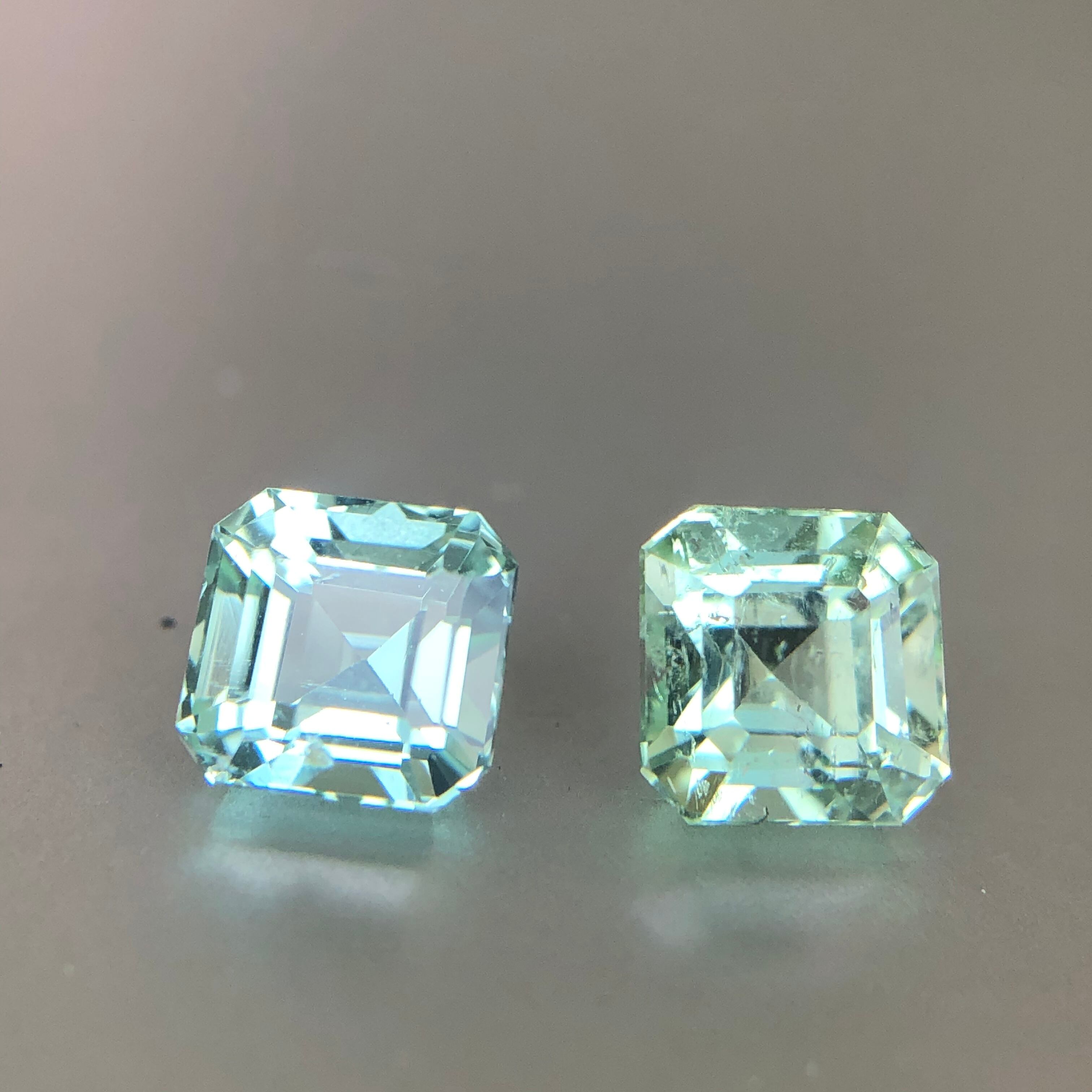 まだどのくらいの産出が出来るか調査出来ていませんが特にこの美しいミントの色はブームが来て高くならないうちに私も少し手元に置いておきたいと思うくらい魅力的な石であることは間違いありません。写真は外の自然光で撮っています。柔らかなパステルカラーと透明感が何とも言えないくらい美しい石です。今回は殆ど同じ大きさの2つの異なる色の石をペアにしてみました。ピカピカとよく光るミントトルマリンのアッシャーカットです。