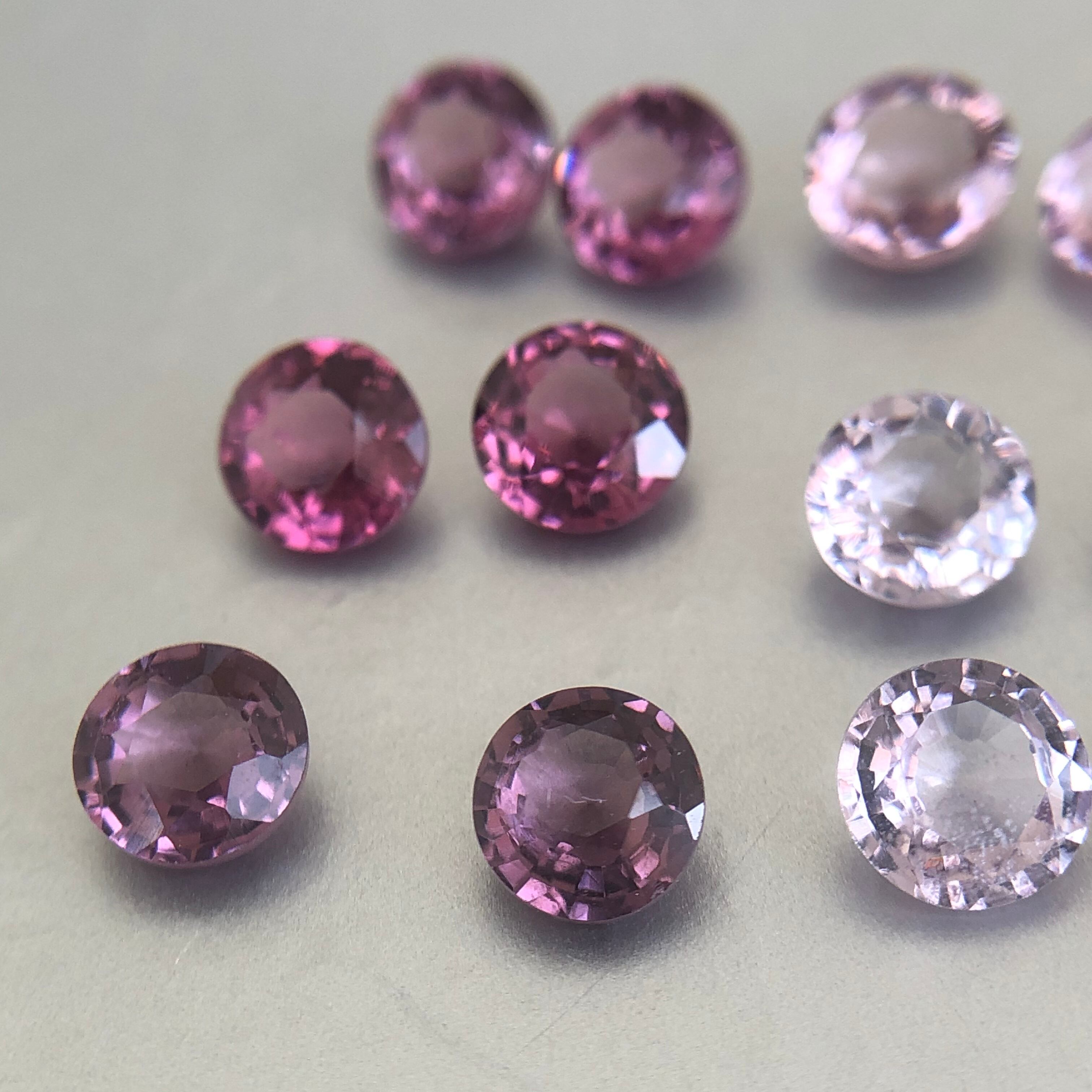 華やかなピンク、モーヴ、レッデッシュパープル、ライトラベンダーパステルピンク、オレンジを感じるパパラチアカラーなど高品質の本当に美しい色のスピネルのマッチングペア1ctオーバーです。どの石も今回チャリティーのお金を届けてくれたインドグジャラート出身の業者さんが世界中のダイヤモンドや色石がカットされるグジャラートで買い付けた石です。全ての色があると言われるスピネルでラウンドのマッチングペア、しかも大きな1ctアップのものを揃えることはとても難しく、今回も買い付けたラウンドの300ピース以上の石から取れたペアは今回の写真のペアと今週販売予定の残りの10ペアのみです。