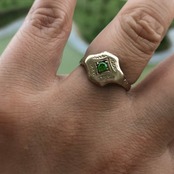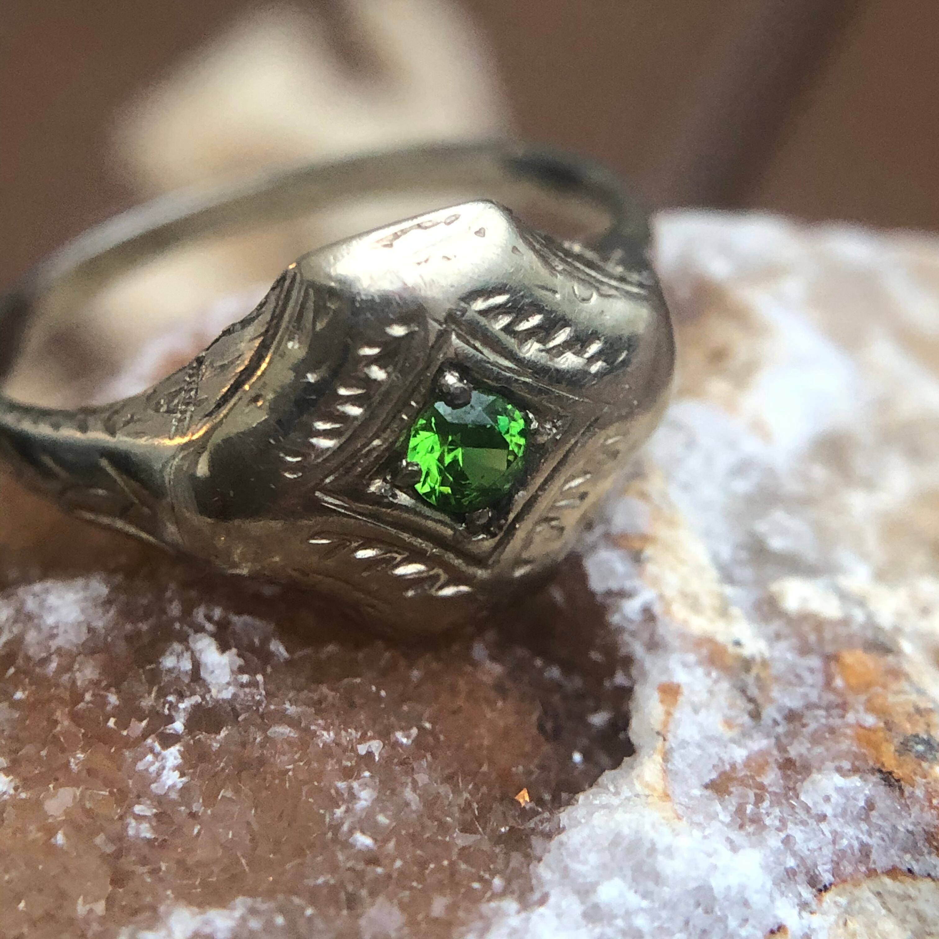 少し変わったアール・デコモチーフの中央にはロシアのデマントイド特有の瑞々しい煌めきを持つデマントイドガーネットが丸みのあるロゼンジのホワイトールドの台座にセットされてその周りにアールデコ洋式の模様が彫られています。アメリカが最も華やかだったフランボヤントな時代の1920年から1930年代に製作されたリングと思われます。