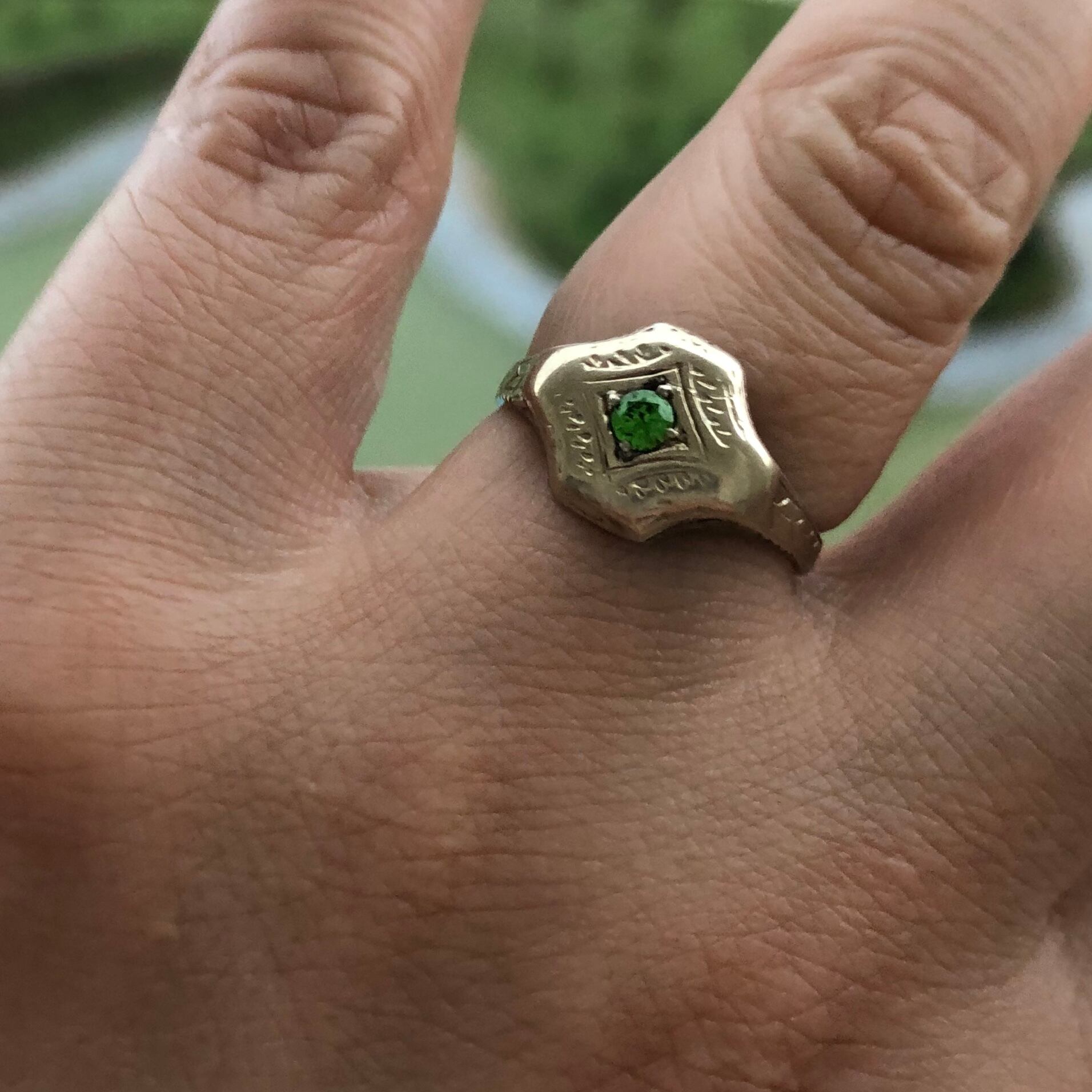 小粒でもピリッと発色のよいデマントイドガーネットが大人の女性にもぴったりの上質な佇まいを醸し出しマニッシュでシンプルな装いに似合いそうなリングです。