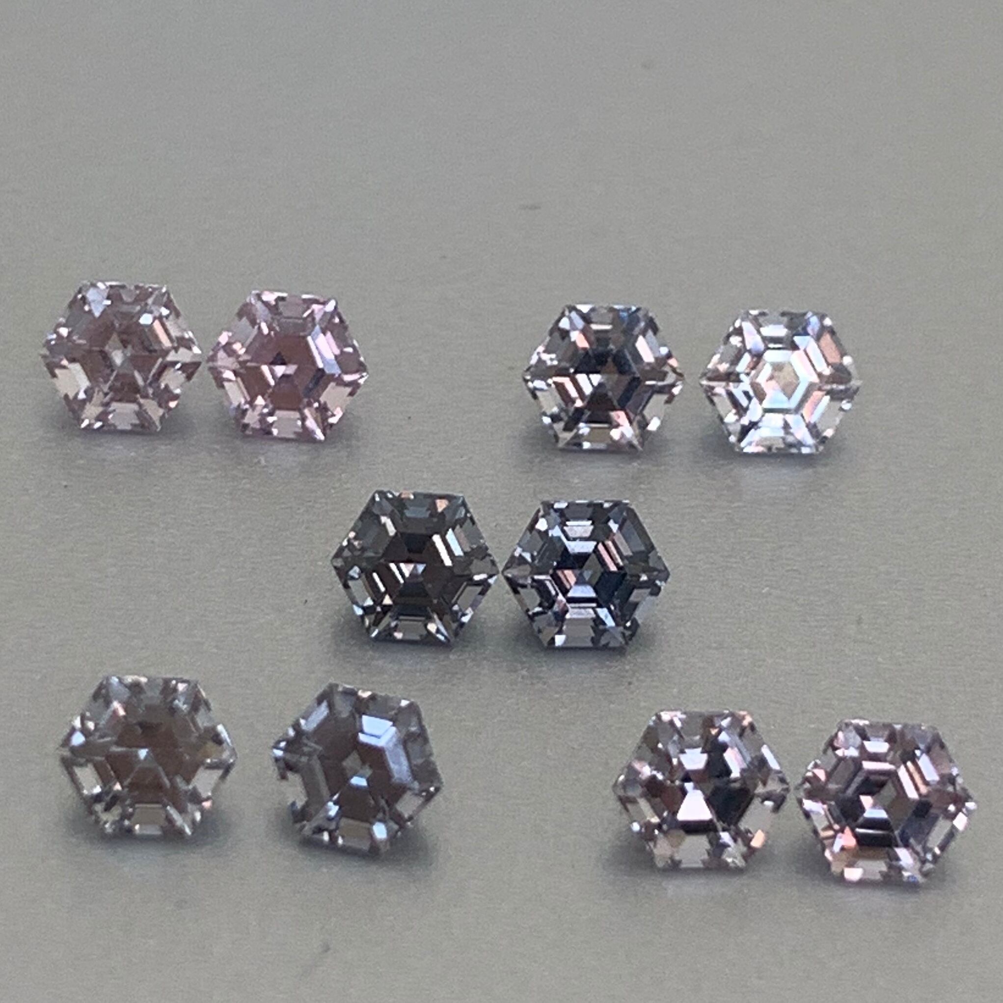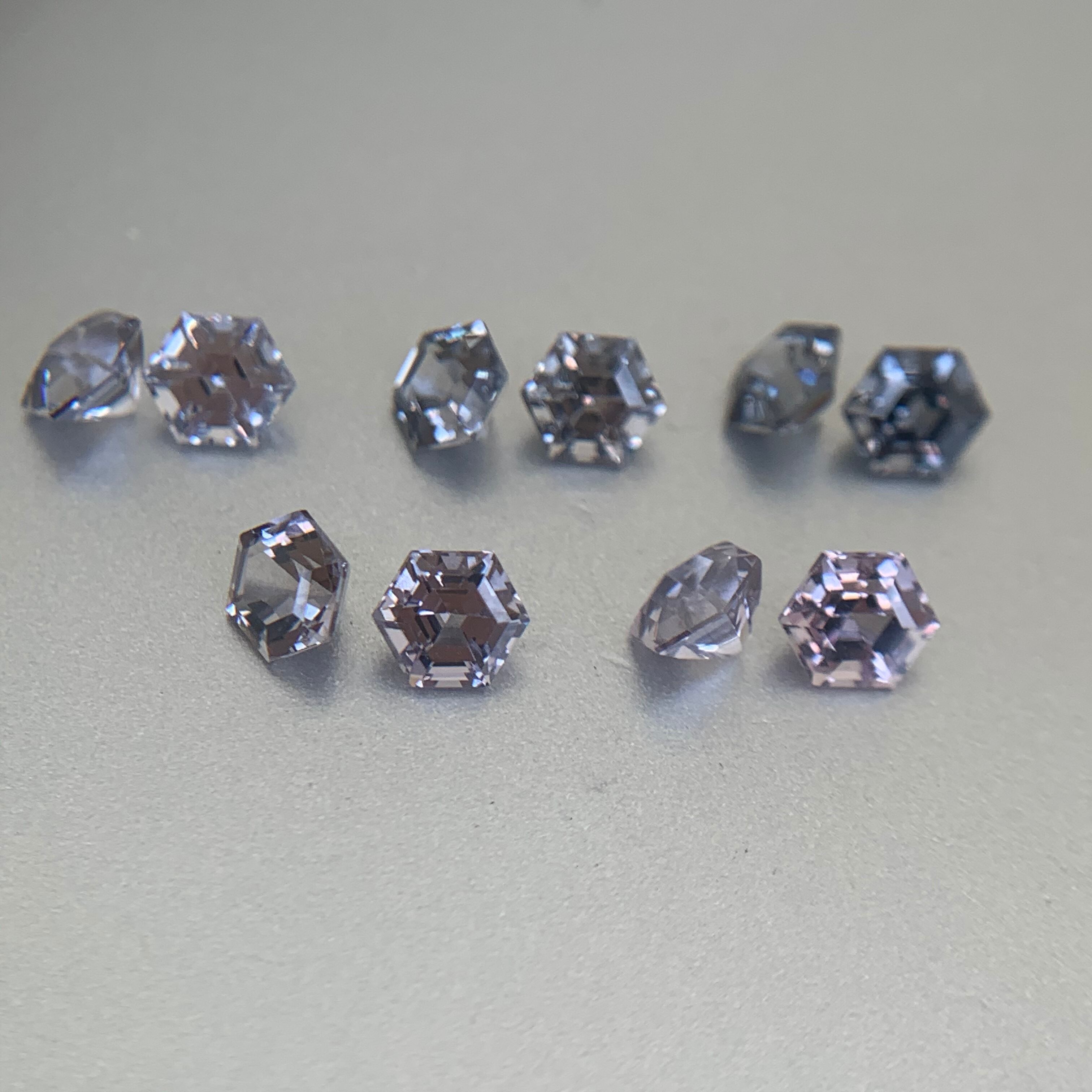 小さな3.5mmの六角形のスピネルを原石からカットしてもらいました。パワーストーンは信じないのですが、六芒星を思い起こさせる端正にカットされたこの形にはとても引かれ何度かお守り的な意味も勝手に込めてこの形の六角形のスピネルを販売致しました。とても人気のある形ですが、もうすこしリーズナブルで小さな物が欲しいとのリクエストを受け、イスラエル人の凄腕カッターさんにこのスピネルをカットしてもらいました。なんと3.5mmという小さな六角形のスピネル。
