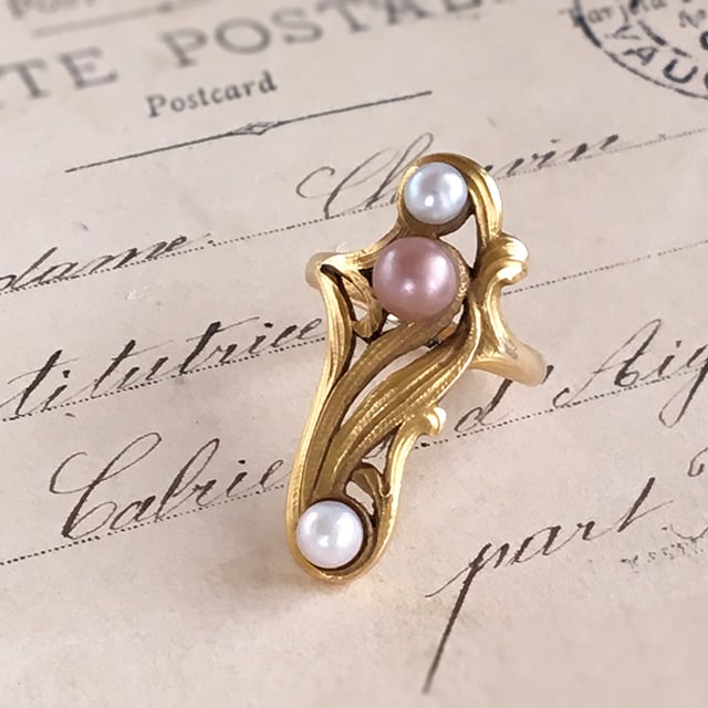 アールヌーボーの曲線の中にリズミカルに配された3つの天然真珠。