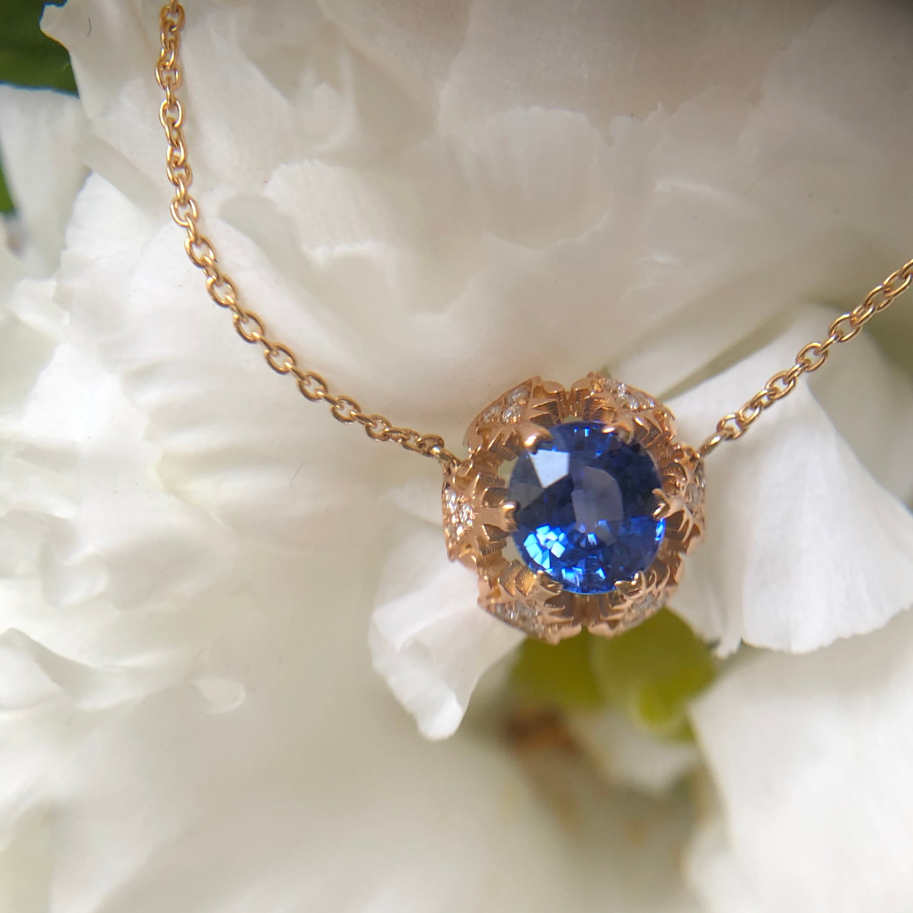 ドキッとする様な美しいブルーサファイアのペンダントです。王冠のようなローズゴールドの枠に小粒のダイヤモンド、この綺麗な王冠のような枠を作るのに数ヶ月、何度も何度もやり直してデザインをして、手を加えて完成した美しい枠が魅力的なペンダントです。チェーンにはアジャスターも付いているので夏には少し短く、冬にはタートルネックなどに少し長くしてお好きな長さでご使用いただけます。