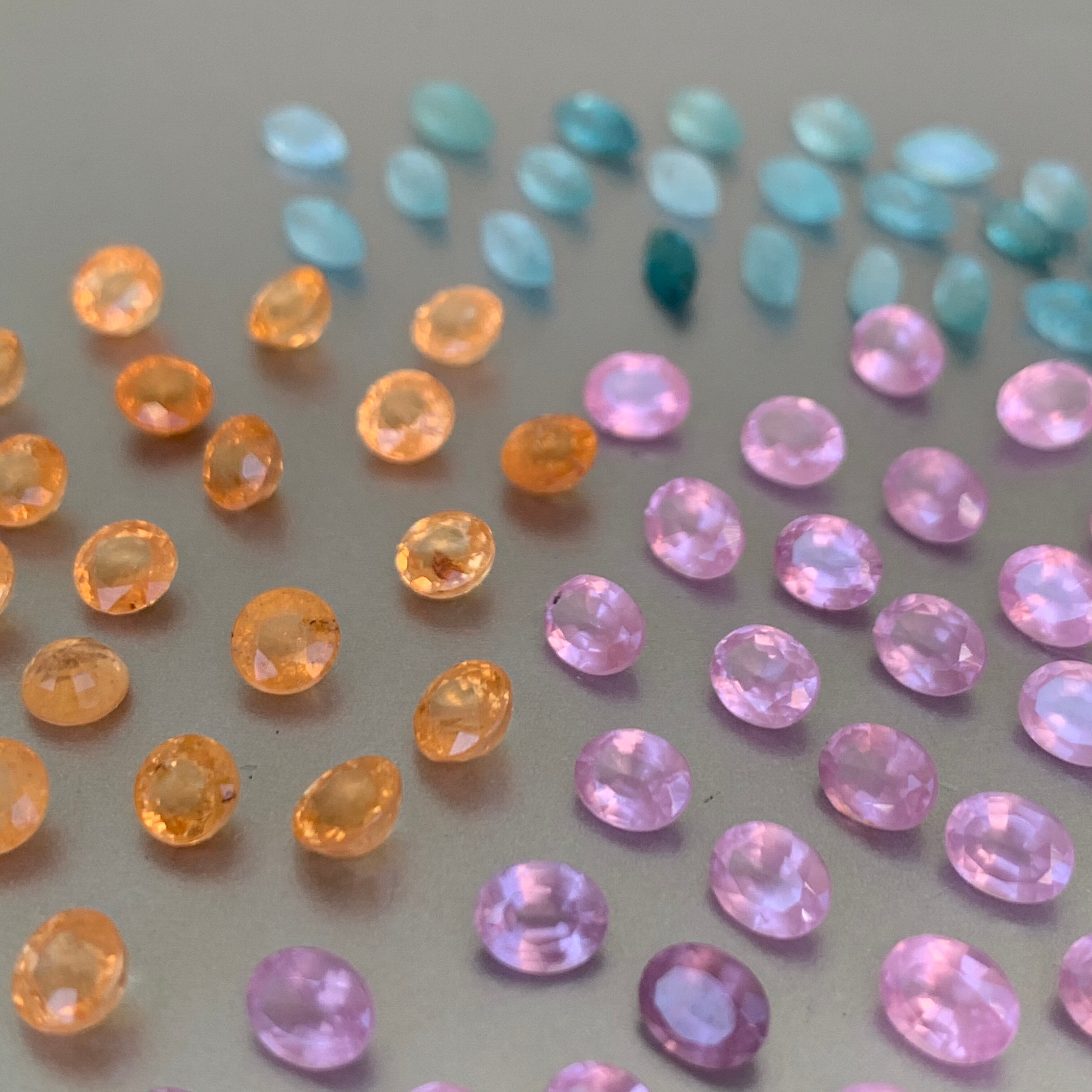実はコロナで長年宝石に関わってきた自分に何ができるかと言うことで、今までのアンティークジュエリーの販売に加えて世界中のダイヤモンドや色石のメレと云う小さなダイヤモンドカットが施されるインドのグジャラートという場所でチャリティーを行ってきましたが、そんな活動をする為にちゃんとお金を現地に届けてくれる人を探して探して出会ったのがこの珍しいい色石をグジャラートでカットをしている色石の業者さんです。定期的に彼から面白い石を見せてもらっていますが、宝石商になり28年ですが特に今流行りのシルキーカラーや蛍光色は今までの見たことがなく色の組み合わせのデザインの可能性を広げてくれています。今回のセットはそのシルキーのオレンジのガーネットにシルキーのグランデディエライトを組み合わせたものか、シルキーのピンクスピネルにシルキーのグランデディエライトを組み合わせたものどちらかになります。数をご用意しましたので焦らずにゆっくりとどちらかお好きな石をお選びください。セットAもセットBも人気のウズベキスタンで手織されたイカット織のポーチに入れてお届けいたします。