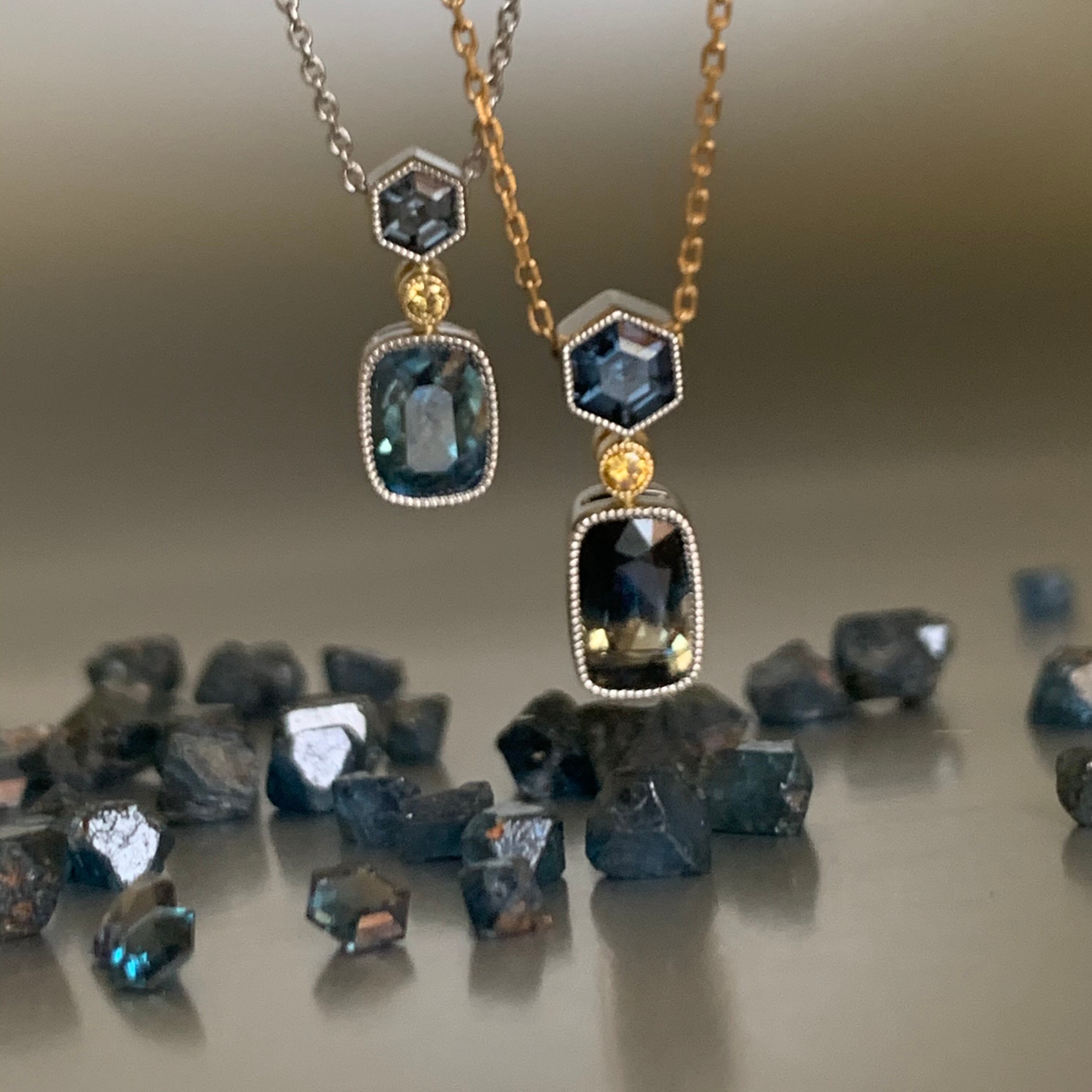 Wishing on a Star 星に願いを。。。アフリカの夜明けをイメージしてデザインしたペンダントです。非加熱のバイカラーサファイア、六芒星をイメージした六角形にカットした非常に希少なガーナイト、最近入手が少し難しくなったナチュラルなヴィヴィッドなイエローダイヤモンドを合わせてミル打ちを施してペンダントに仕立てました。この美しいブルーと黄金色のバイカラーサファイアは友人の宝石商から入手しました。アフリカ大陸の南東海岸部から沖へ約400キロメートル離れた西インド洋にあるマダガスカル。マダガスカルのイラカカにストーンハンターの宝石商の友人が数ヶ月滞在して毎日のように採掘した石を買い付けた石やその自然について現地から連絡してくれた日が昨日のようです。随分と以前からマダガスカルで採れる石に注目して現地でサファイアやグランデディエライトなどの石を買い付け私も随分と彼から面白い現地の状況や鉱脈の話を聞くことを楽しみにしています。六角形にカットされた美しいブルーのガーナイトは今では希少石として入手が難しい石ですがこちらはアメリカの有名な石のコレクターでディーラーから入手をしてイスラエル人のダイヤモンドカッターさんにカットを施してもらいました。