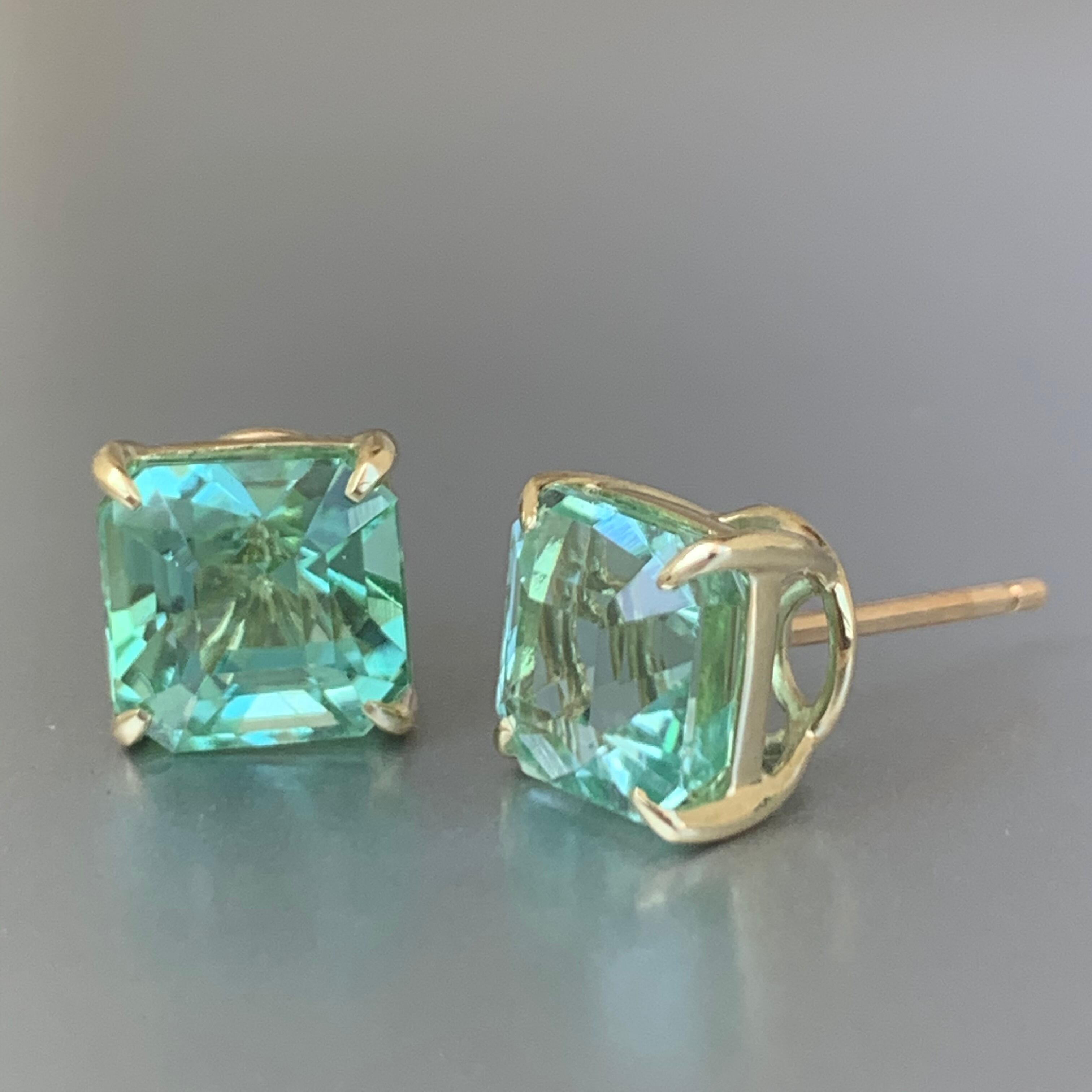 大粒のミントグリーンとアクアミントの二つの色の非加熱トルマリンのピアスです。透明感の高いこちらのトルマリンの原石を分けて貰い、1番美しく見えるアッシャーカットを施した石を2石。左右ミントグリーンとアクアミントの二色の色違いのピアスです。正直左右にしてしまうと遠くからはその違いがあまり分からないかもしれませんがお手元で見ていただくとこの違いがよくわかると思います。お客様からお電話でお勧めの色を!と聞かれるのですが正直こちらの産地のトルマリンはどの色も魅力的で私もお勧めに困ります。先日サロンにご来店いただいたお客様にアップルグリーンの石をお選びいただきピアスをオーダーいただきましたが、やはりアクアミントも忘れられないのでと言うことで左右違いのピアスも1ピース作ることになりました、完成品があまりにも素敵なので最初から左右違うお勧めの色でピアスを作りました。