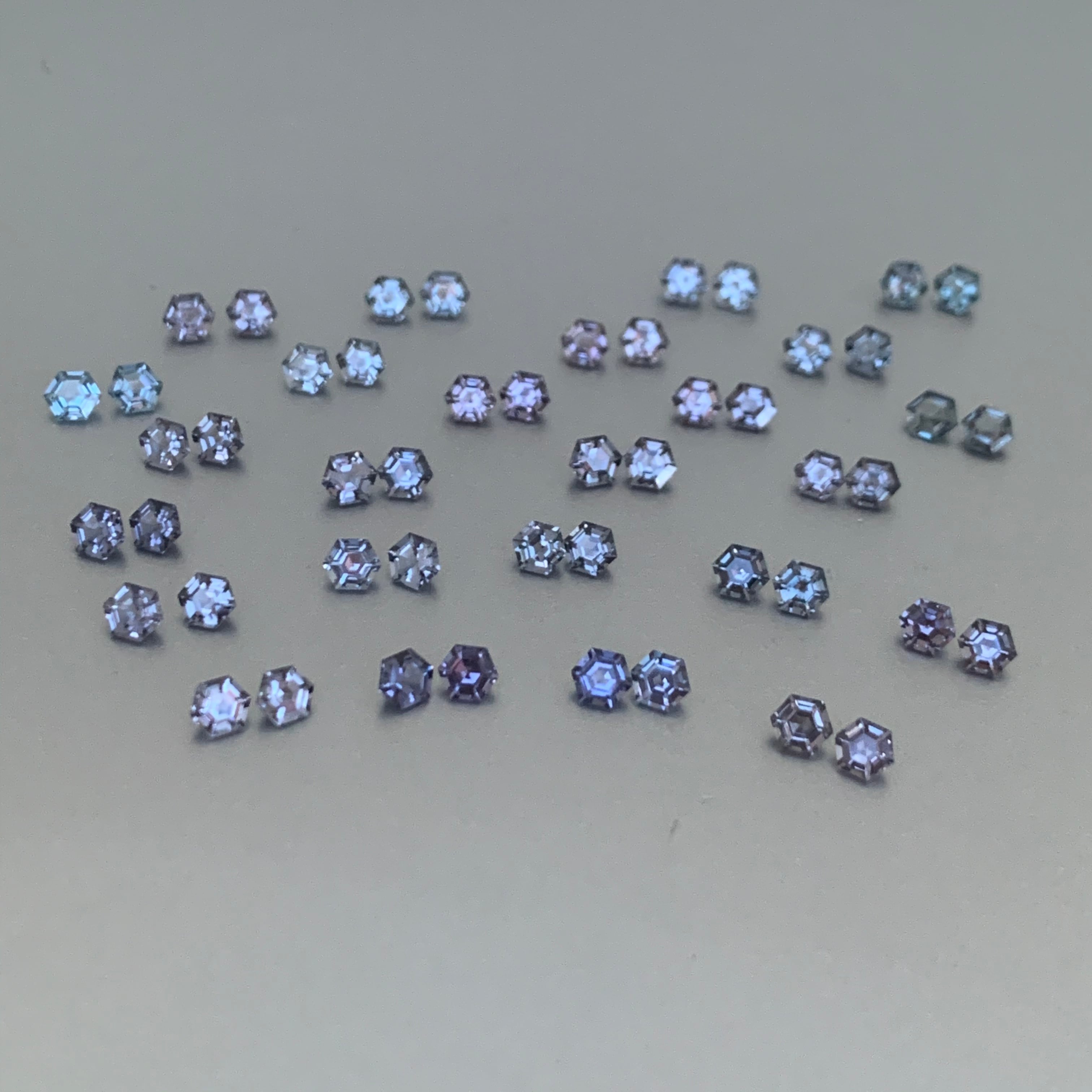 石は選べませんが、どの石もこの特殊カットのせいで角度によって少し紫色がかったりグレーに見えたりが光の当たり方で濃く見えたり薄く見えたり本当に魅力的で美しいライトパープルグレイのスピネル2ピース(ペア)の販売です。