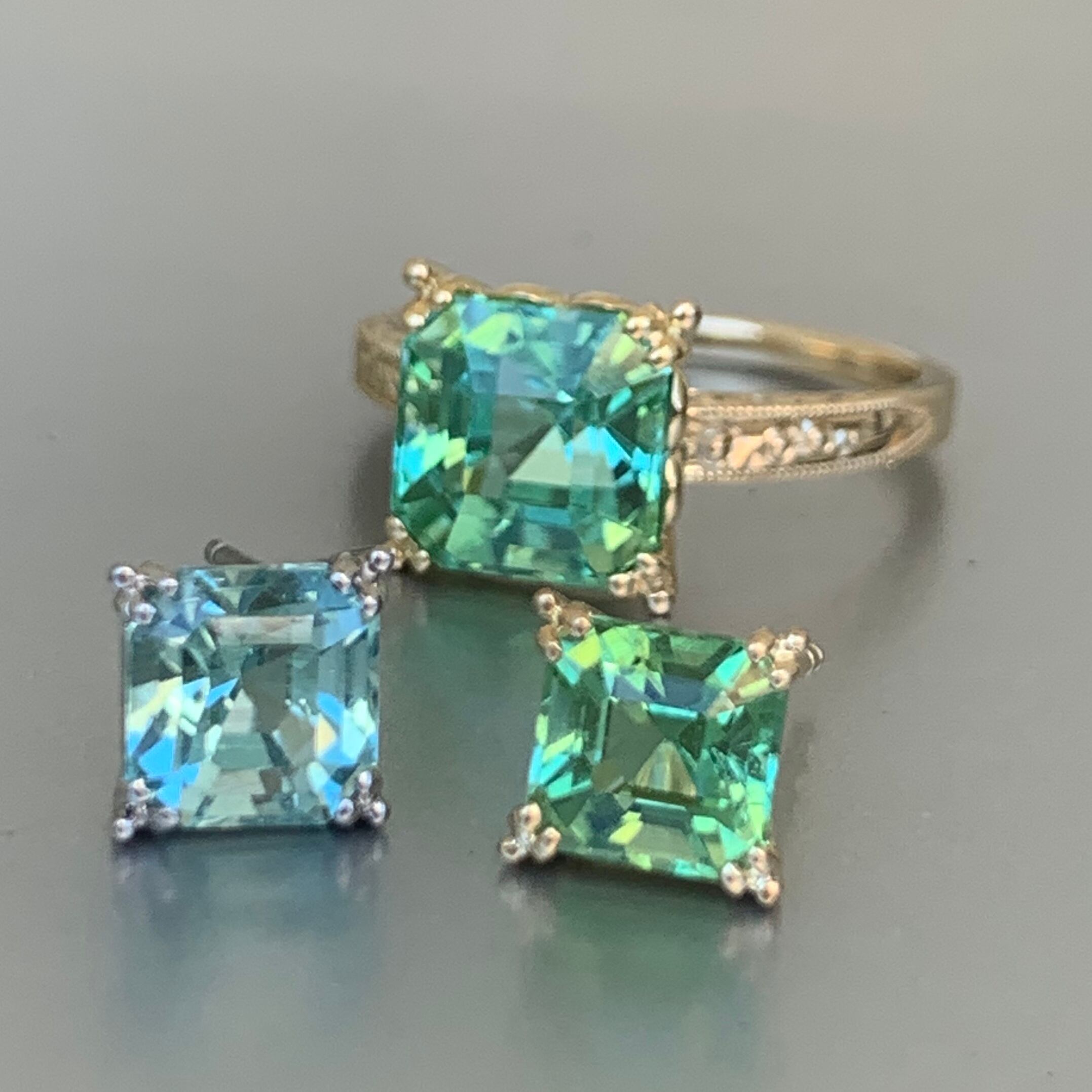 とても美しいトルマリンのリングです。写真ではわかりにくいのですが、一つの石の中に、ミントグリーンとアップルグリーンの二色の色が見れます。ヴィクトリアンボックスの得意とするアンティークスタイルの職人産の技が光る手作りの三つ爪の枠に大粒のすっきりとしたアップルミントグリーンの非加熱トルマリンをセットし、シャンクにはミル打ちと美しいアンティークの図案からインスピレーションを受けた彫をタガネ彫で施しました。原型を作る職人さん、ミル打を施して石留めをする職人さん、タガネで金属を切りながら彫を施す三人の職人さんの息がぴったりとあった日本の職人さんのコラボレーションで出来上がったリングです。