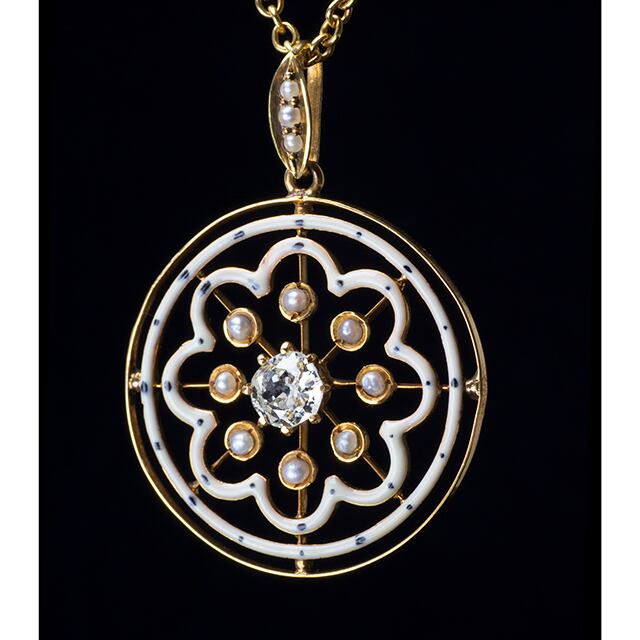 瑞々しい輝きの大粒のオールドマインカットダイヤモンドと柔らかなオフホワイトのエナメルと白銀色のナチュラルパールが織りなす3色の白のハーモニーが爽やかなペンダントです。