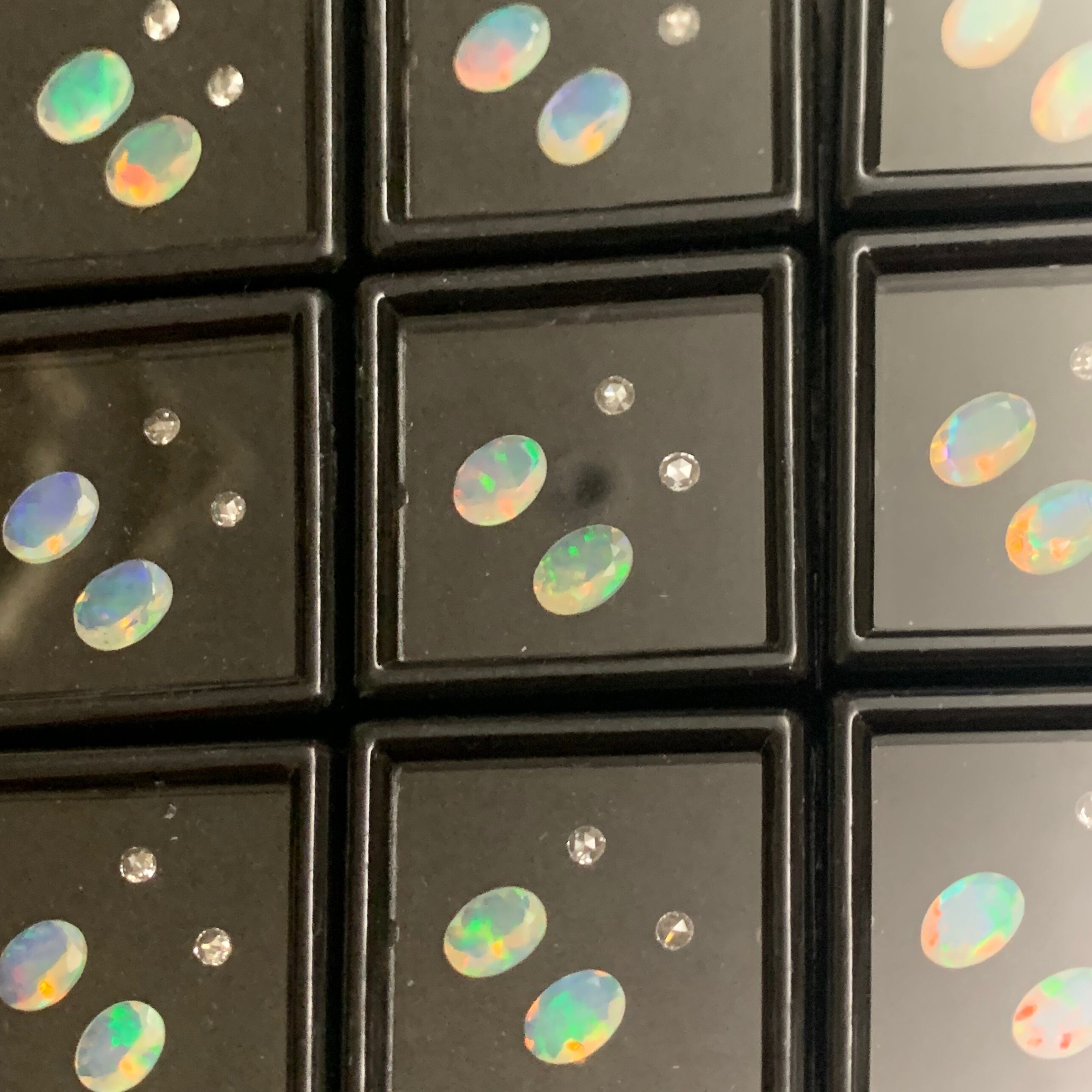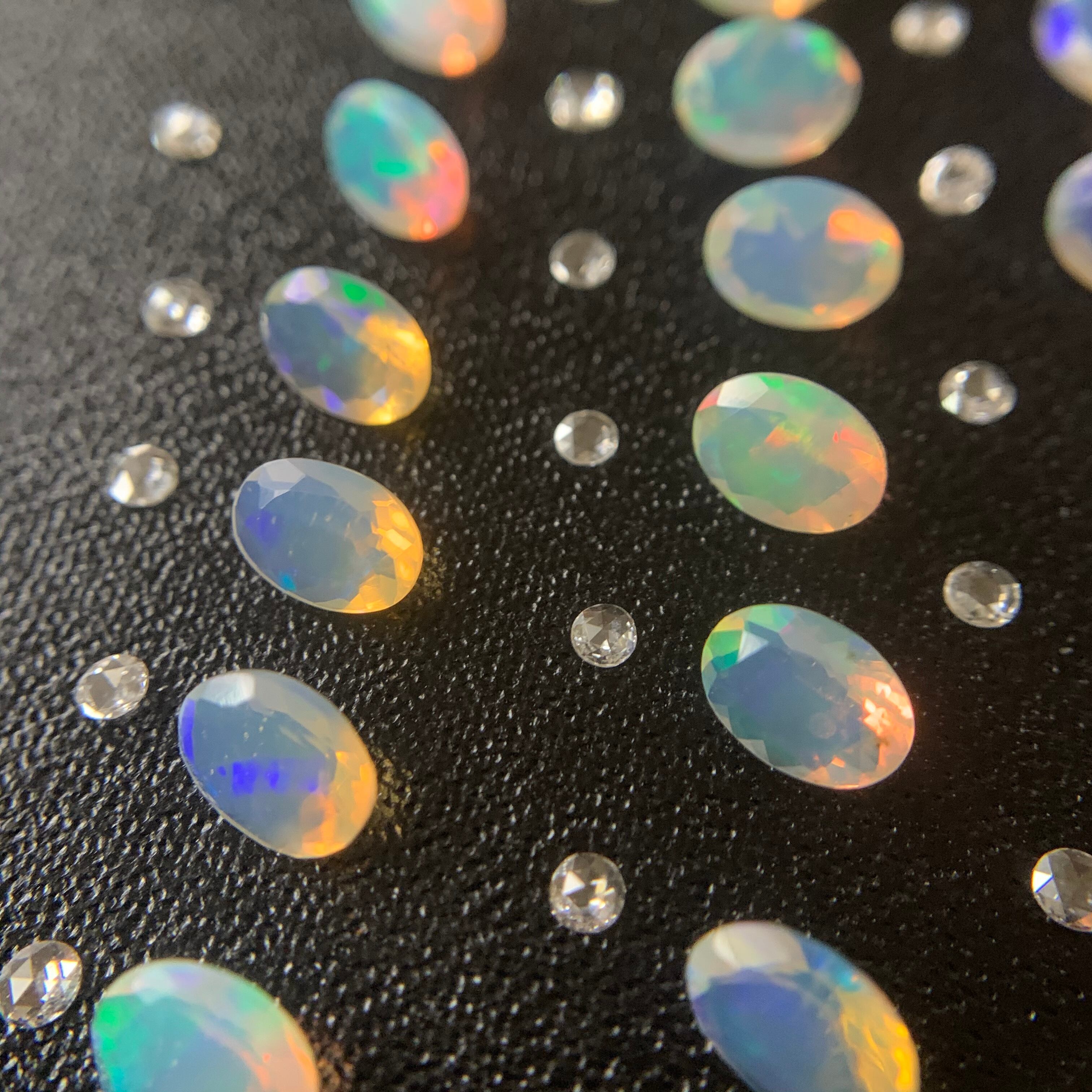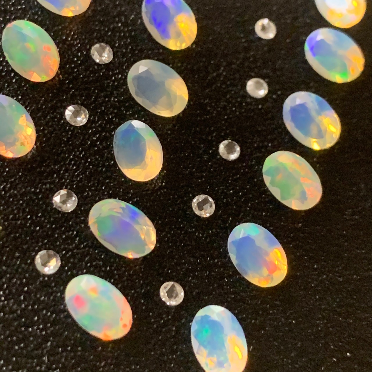 今月の誕生石オパール。エチオピアで採れたこのオパールは加工の際には汗や汚れに弱いのでリングよりもピアスやイアリングに向いていると思います。遊食効果、英語でPlay of Colour と言うその名の通り、光によって見ているだけでも楽しく美しい色の変化があります。緑、オレンジ、ブルーなどのミックスカラーはこれから深まる秋のファッションにもぴったりです。写真より実物はもっともっと美しくお手元に届くとサプライズがあると思います。