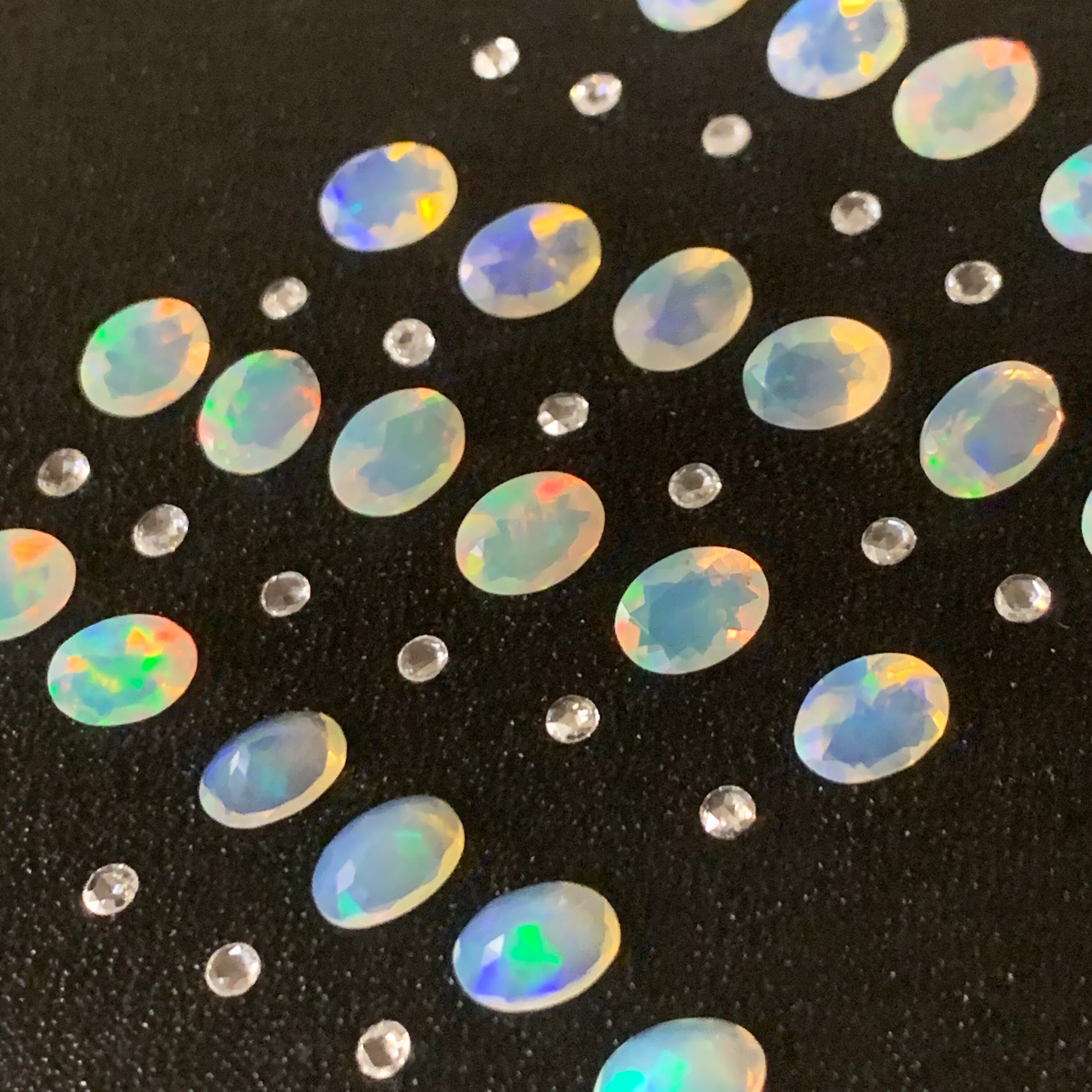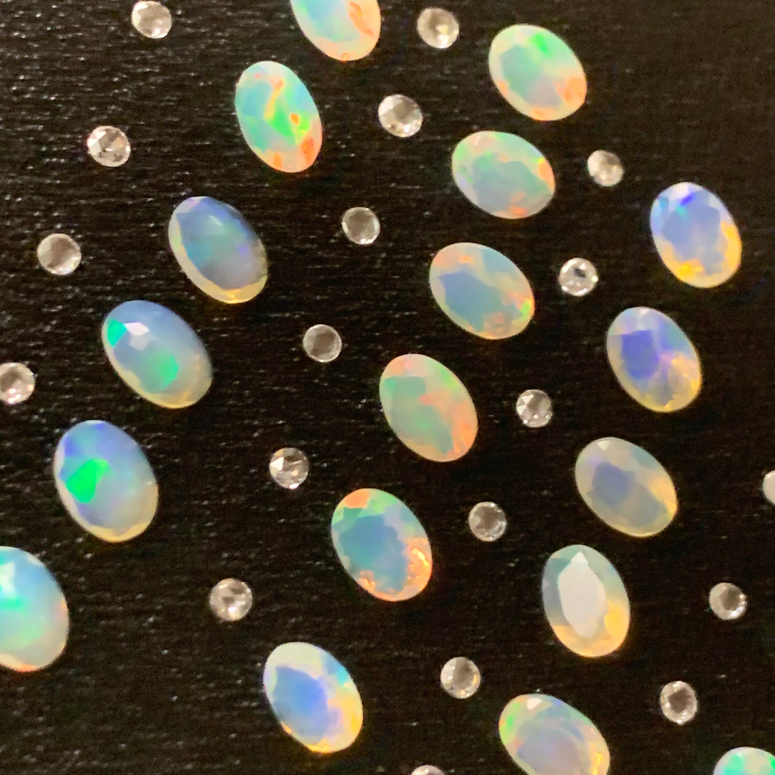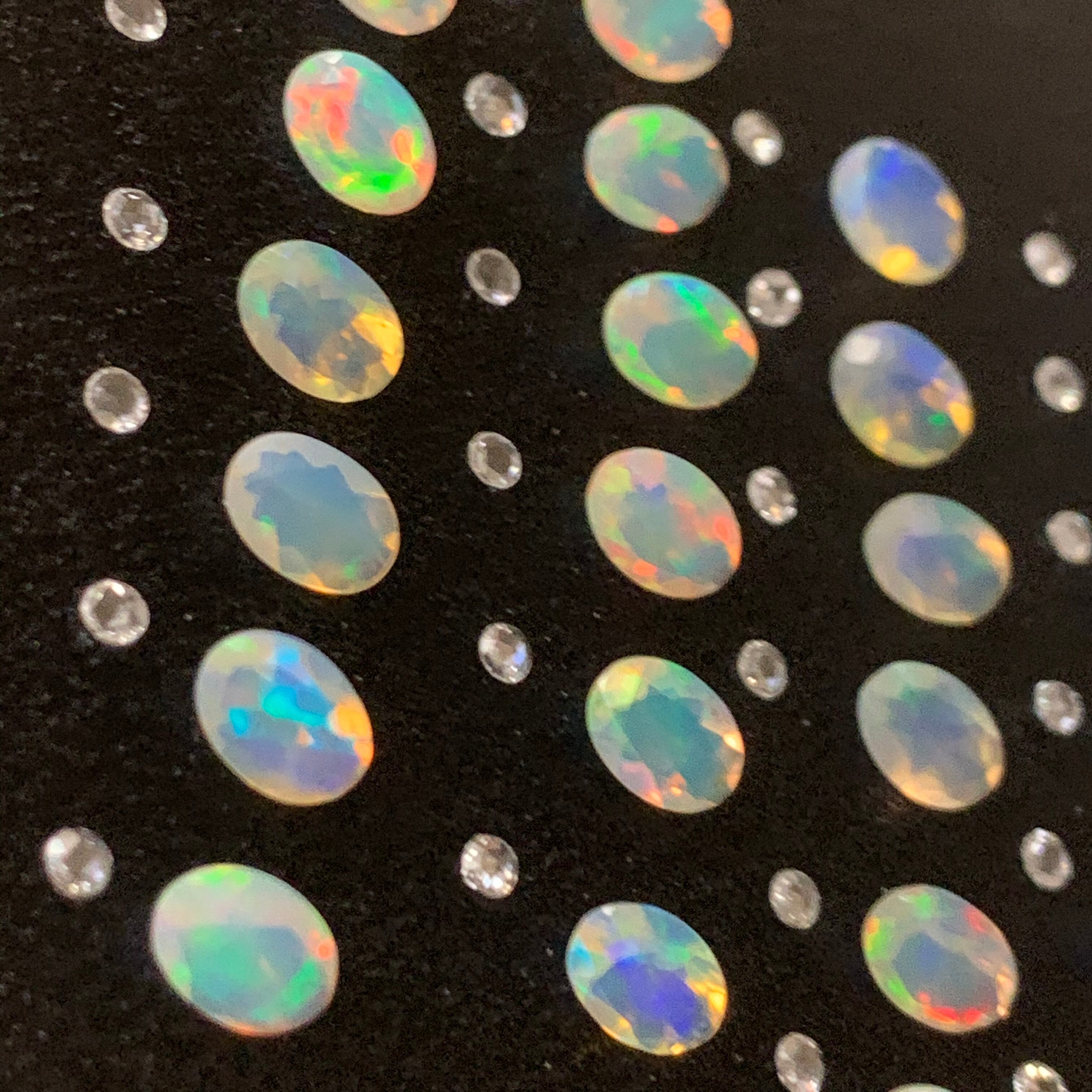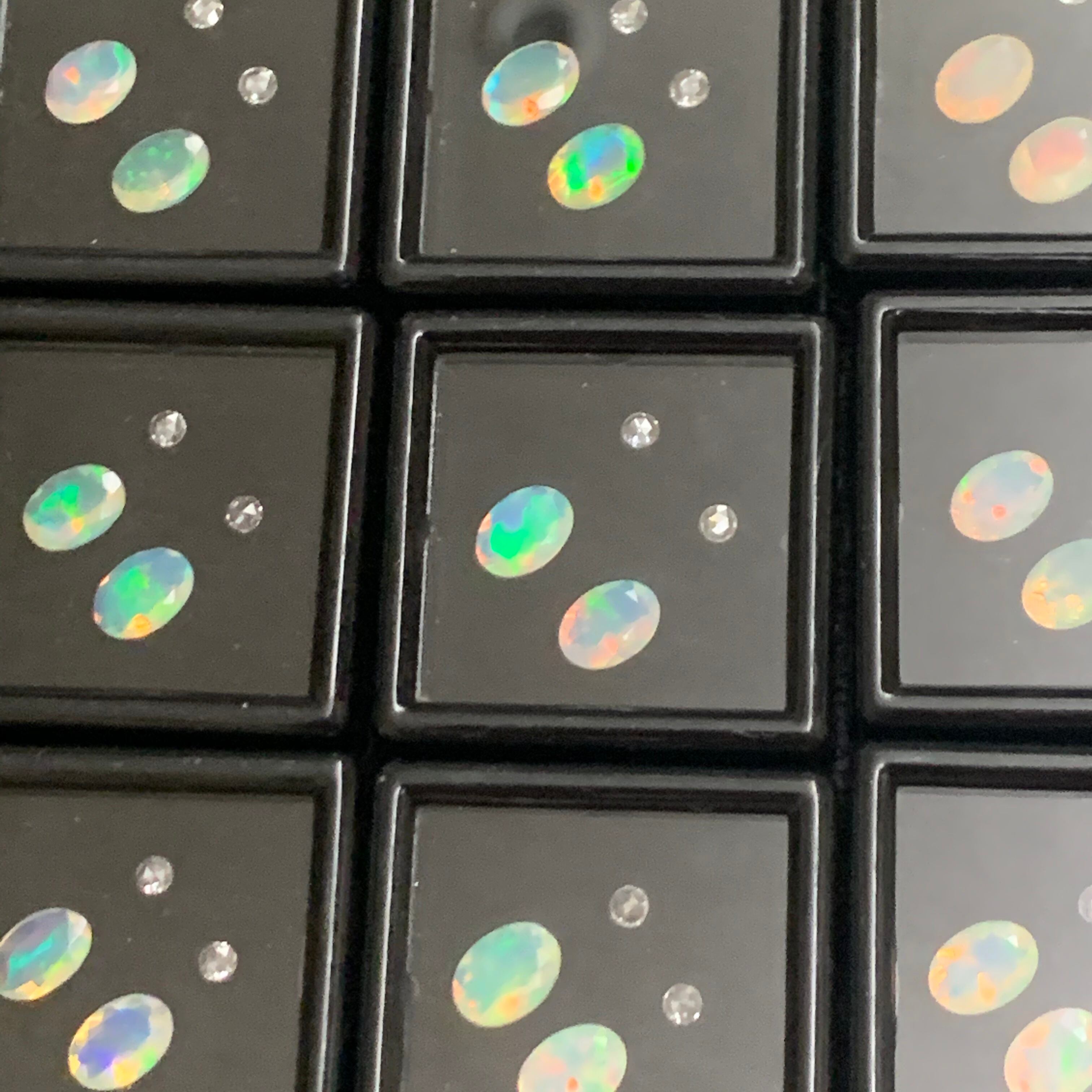 今月の誕生石オパール。エチオピアで採れたこのオパールは加工の際には汗や汚れに弱いのでリングよりもピアスやイアリングに向いていると思います。遊食効果、英語でPlay of Colour と言うその名の通り、光によって見ているだけでも楽しく美しい色の変化があります。緑、オレンジ、ブルーなどのミックスカラーはこれから深まる秋のファッションにもぴったりです。写真より実物はもっともっと美しくお手元に届くとサプライズがあると思います。