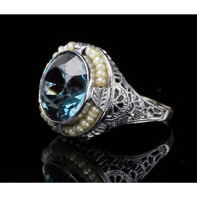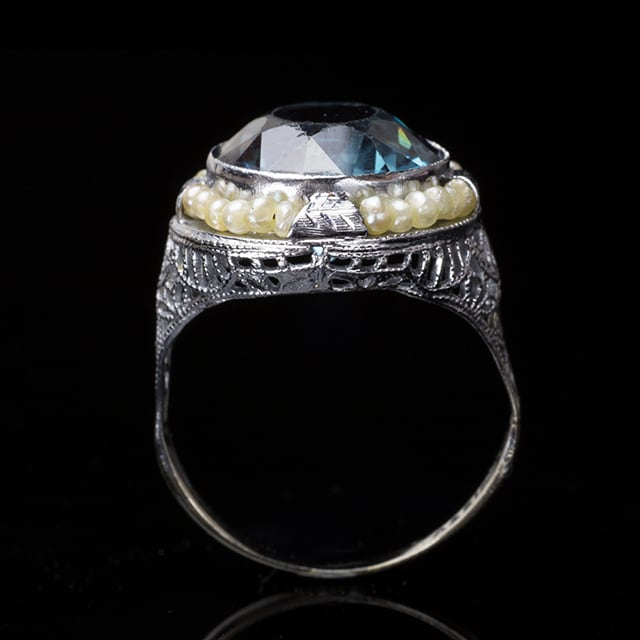 大粒のジルコンを取り巻く海の泡のようなシードパールやレースを模したホワイトゴールドのフィリグリーの透かし細工が目にも涼やかで夏が来る度に思わず手に取りたくなってしまう美しい碧のリング。