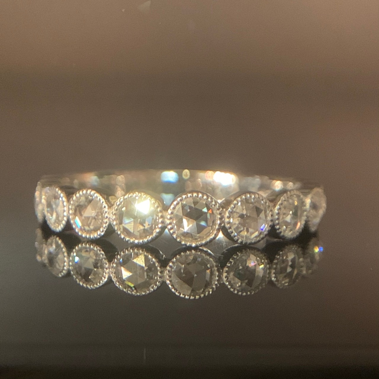 センターのローズカットの直径は3.1mmアップで3mmから少しづつ2.5mmまでとほんの少しだけグラデーションをつけたリングはつけやすく、センターのダイヤモンドが大きめでミルが打たれる為、クラシカルでつけやすいけれどしっかりとした大人のエタニティーリングになります。