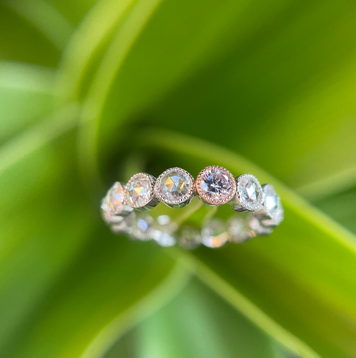 既に閉山してしまったアーガイルのピンクダイヤモンドをセンターにピンクゴールドで巻き、残りもすべてミル打ちまたは爪留めでセットした良質のDEカラーのVSクォリティーの2.4mmのラウンドのローズカットでプラチナで巻いたフルエタニティーリングです。