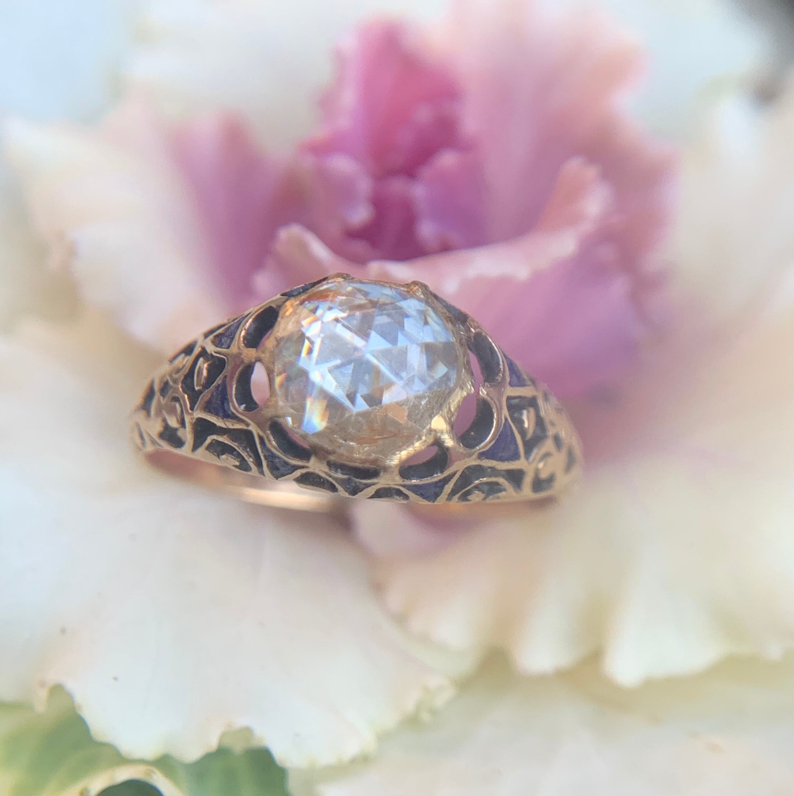 旧ソビエト連邦グルジア共和国、現在のジョージアで19世紀末に作られたと思われるローズカットダイヤモンドとエナメルの美しいリングです。このタイプのローズカットのエナメルのリングが出るとそのデザインの細かな違いと考えられた美しさ、小さな指輪という面積にここまで完成された形があるのかと感心し、出会う度に心踊るリングです。センターにセットされた大粒のローズカットダイヤモンドを取り囲む、濃紺のエナメルに草花やスクロールをデザインした凝ったゴールドのシャンク。