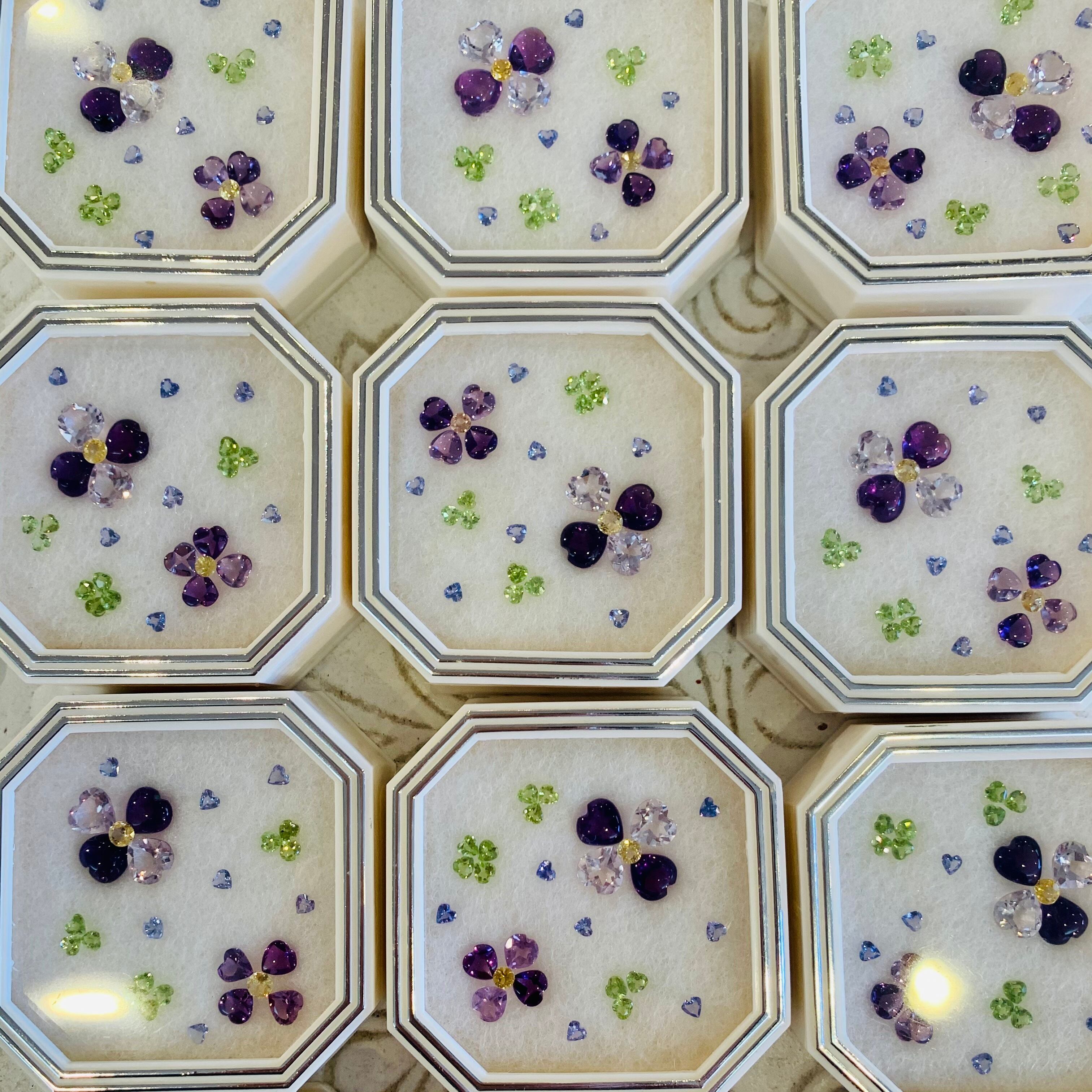 バフトップと呼ばれるカットした宝石の表面だけをつるりとカボションに磨いたアメシストのハートとハートのカット石の濃淡のコンビネーションをイエローサファイアを中心に並べたお花。極小のハートカットのタンザナイトとペリドット。