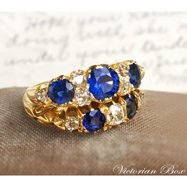 深い深いロイヤルブルーのサファイアに思わず吸い込まれてしまいそうになる美しいヴィクトリアンのスリーストーンリング。19世紀末頃に英国で製作されたものと思われます。