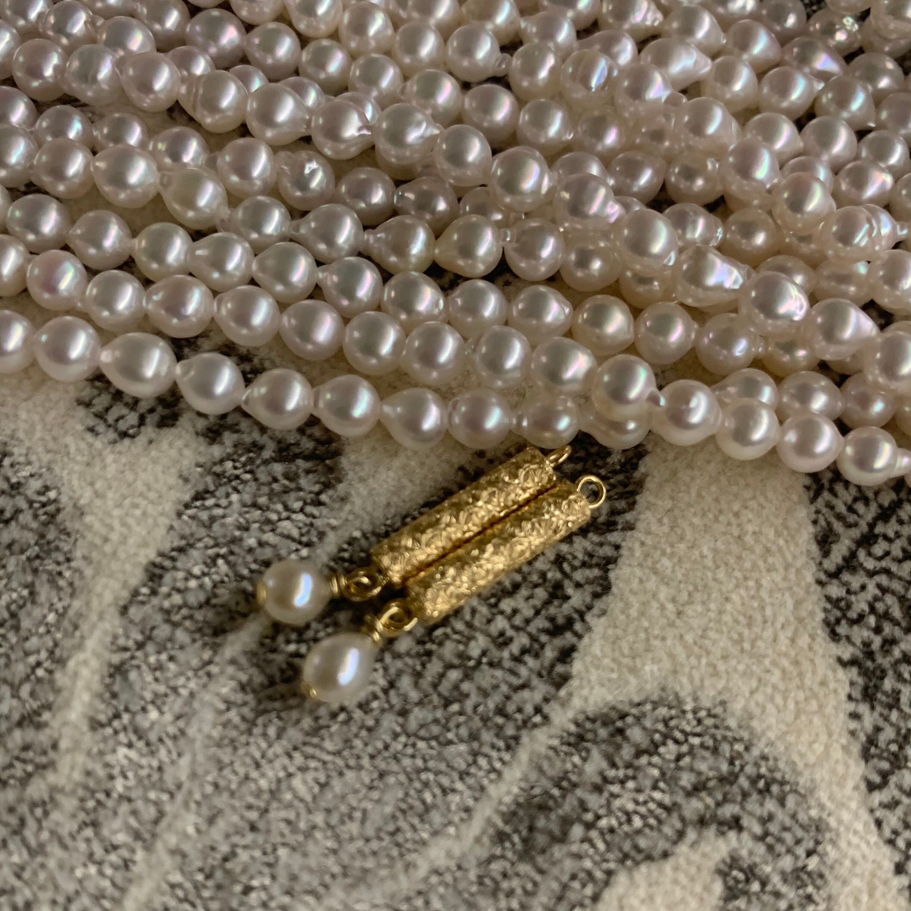 前回販売した人気のバロックパール。今回のネックレスも3ミリから3.5ミリの小さなベビーバロック。今回は和珠らしいほんのり桜色のパールはその小さな大きさと一粒一粒異なるユニークな流れ珠のバロックシェイプ。遊び心のあるその形でフォーマルになり過ぎないエレガンスを演出する事が出来ます。47cmと言う長めの長さですので前回人気の18金のマグネットクラスプをつけてぐるぐると細めの腕の方は巻いてブレスレットにする事が出来ます。