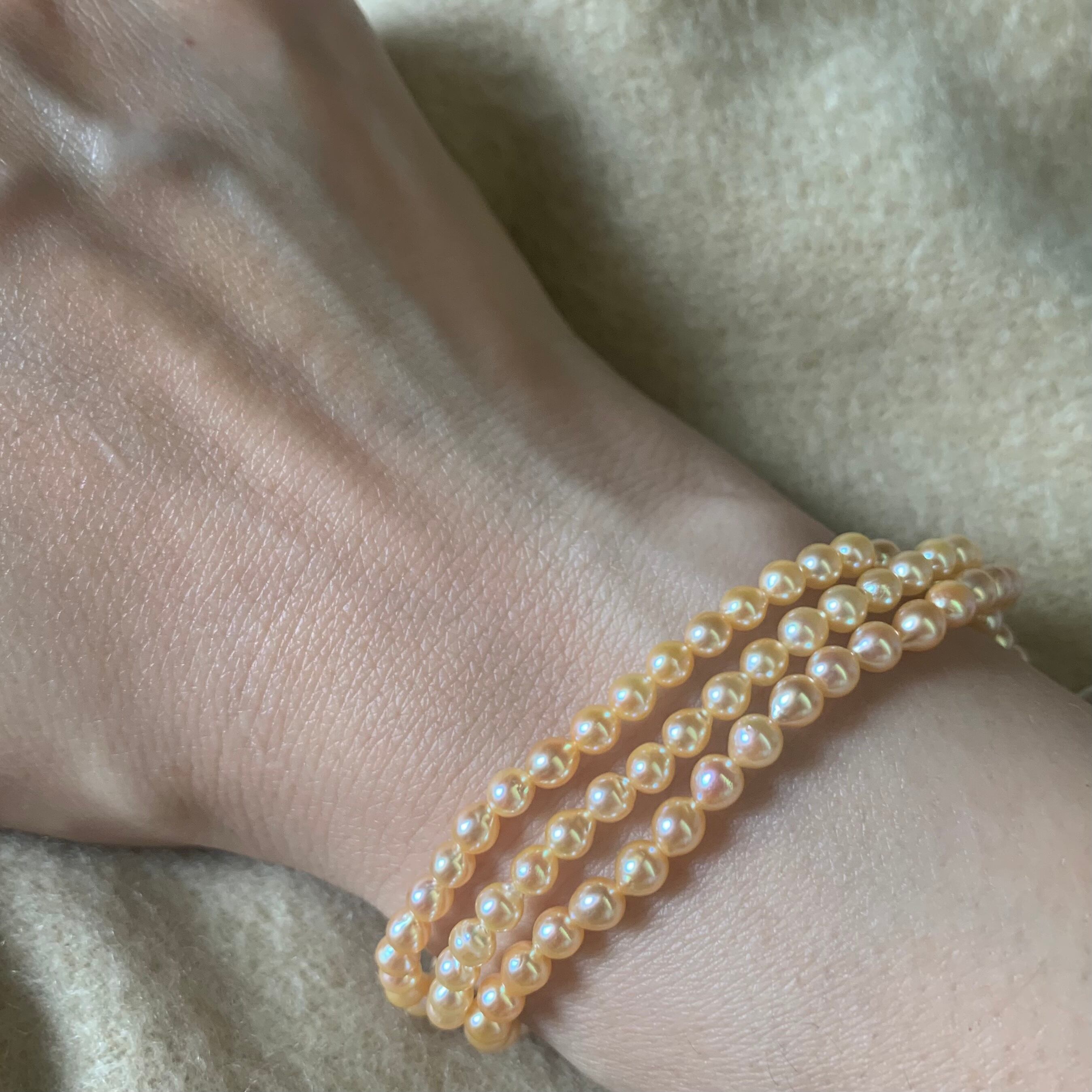 少し長めに一連のネックレスとしてお楽しみ頂くか、腕が細め〜平均の方でしたら3連に巻いてブレスレットとしてもお楽しみ頂けます。こちらの珍しいピーチゴールドの真珠は国内でも美しい丸珠を生産する事で有名な伊勢志摩で採れた真珠でメタリックな厚い巻とテリ、揃ったお色は正統派の美しさがあるアコヤのバロックと言え、特にこのベビーパールを専門用語では厘珠(りんだま))と呼ばれるそうですが、小さな3〜4ミリのベビーパールは9厘(およそ2.7ミリ)までの核を使って作られた事からその様に呼ばれ、厘珠は、他のサイズと比べると生産量がとても少なく、日本全国の真珠生産の1%にも満たないそうです。