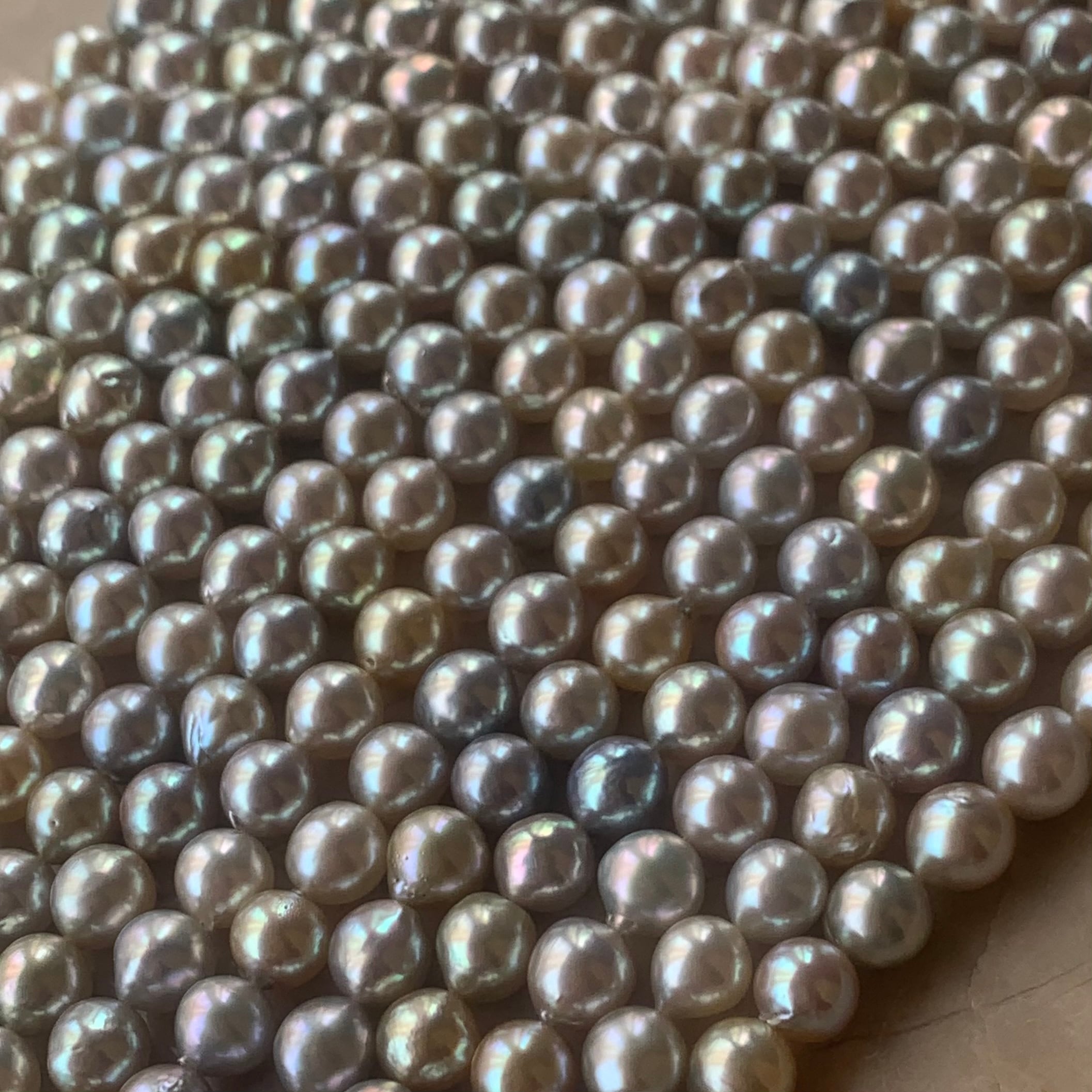 発光しているかのようメタリックに光り輝く色とテリ、巻。白、クリーム、パステルブルー、山繭色など伊勢志摩の海で採れた美しく巻きの良い5〜7ミリと比較的ボリュームのあるオフラウンドのバロックパールを夏色に特別に組んでみました。冬のジュエリーのイメージの強い真珠ですが、このネックレスは敢えて白いシャツやリゾートスタイルのワンピースなどに贅沢に組み合わせ夏の装いをお楽しみ頂きたいと思います。汗や汚れに弱いイメージの真珠ですが、夏でも身につけた後、必ずきちんと真珠クロスで軽く揉み込む様に真珠の表面についた汚れや汗を拭き取り、お手入れをする事で変質する事なく長い間楽しんでいただく事が出来、特にこの様な巻の厚いバロックパールは私も20年程真珠てりクロスでお手入れしながら使用していますが特に目に見える劣化はほとんど見られません。
