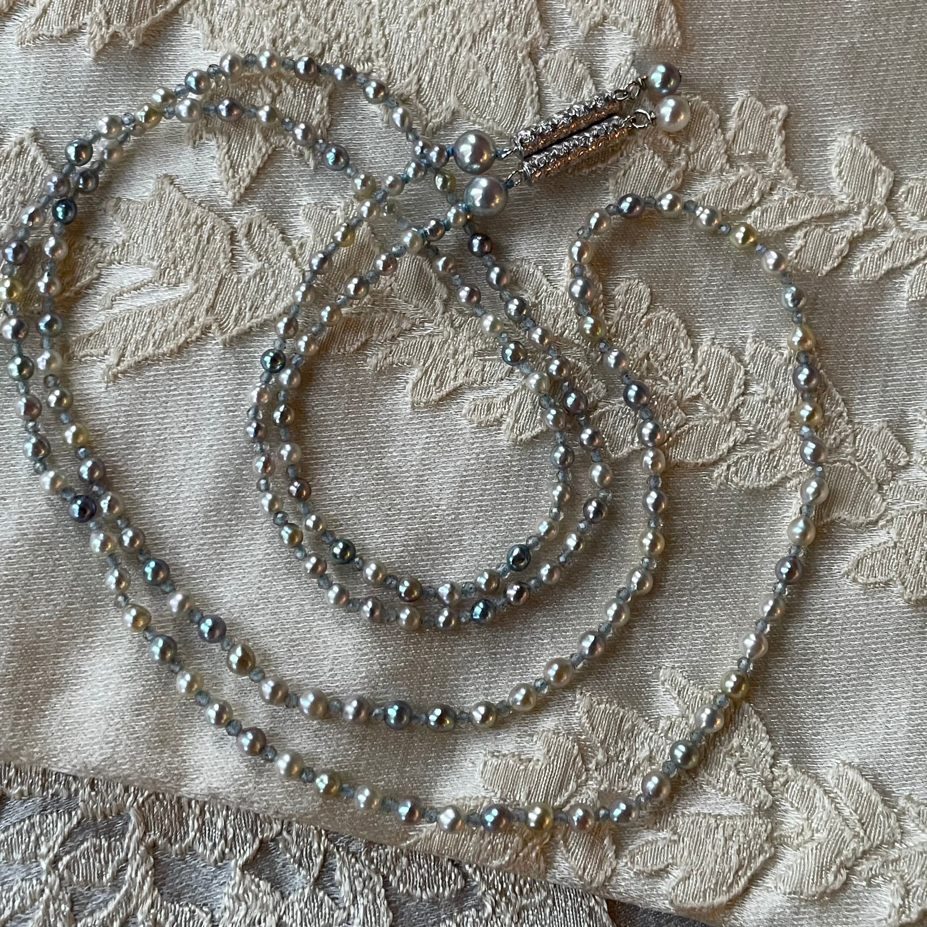 今年は様々な真珠のネックレスを作りましたが、とても気に入って自分のためにも長さ違いでロングに作ったネックレスです。選りすぐりの美しいナチュラルカラーの極小のアコヤ真珠と、細かなカットが施されたラブラドライトのネックレス。様々な天然の色と、細かなカットが施された落ち着いたグレーがベースのブルーや、グリーンの光が出るラブラドライトが、動きに合わせてキラキラと輝きます。パールが約1.5ミリ、ラブラドライトが約1mmですので糸でつなげてあるロングネックレスですがまるでしなやかなチェーンの様な印象を与えます。