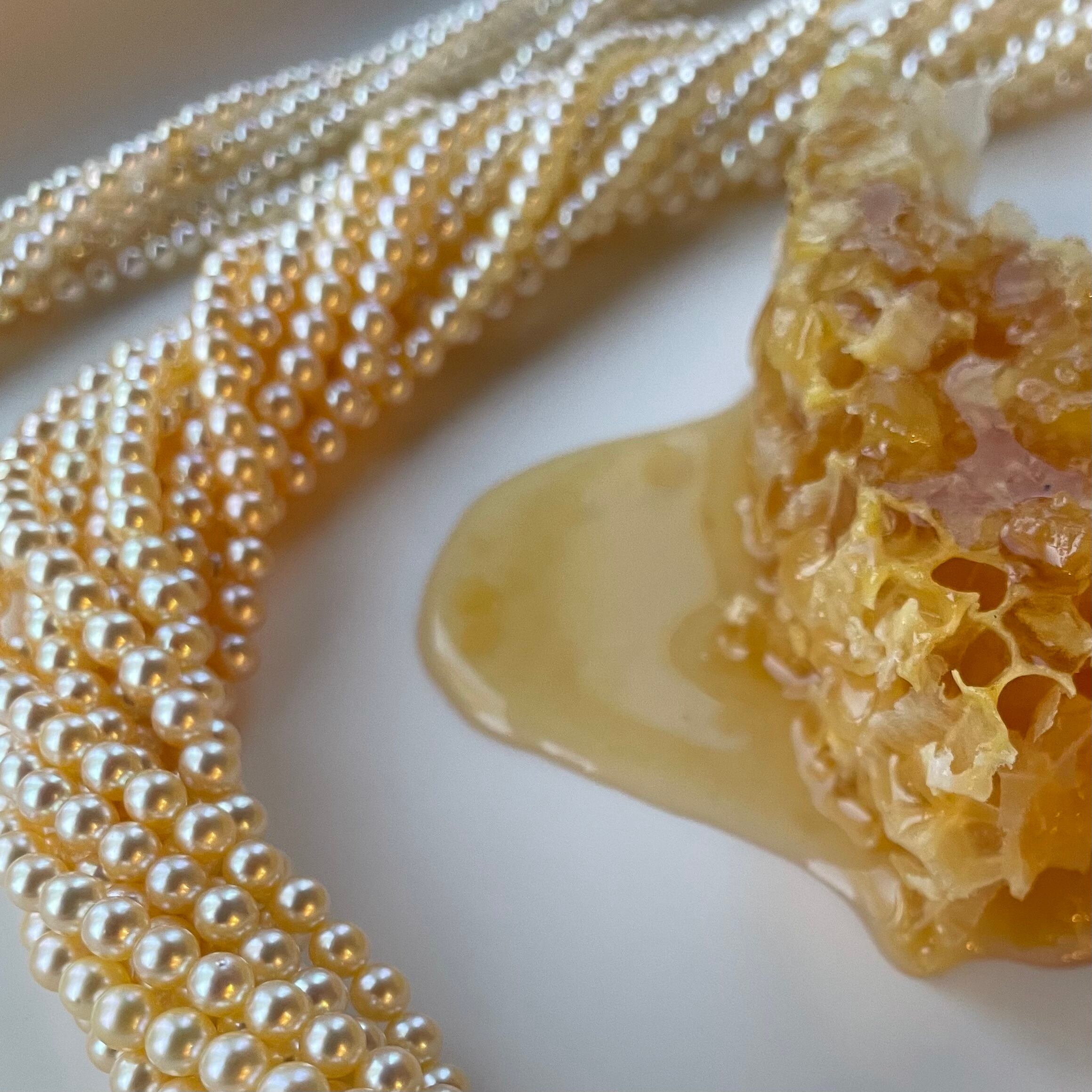 秋色の美しい美しいナチュラルのゴールドを中心にグラデーションカラーの白に組まれた4ミリストレートの無調色のアコヤ真珠です。