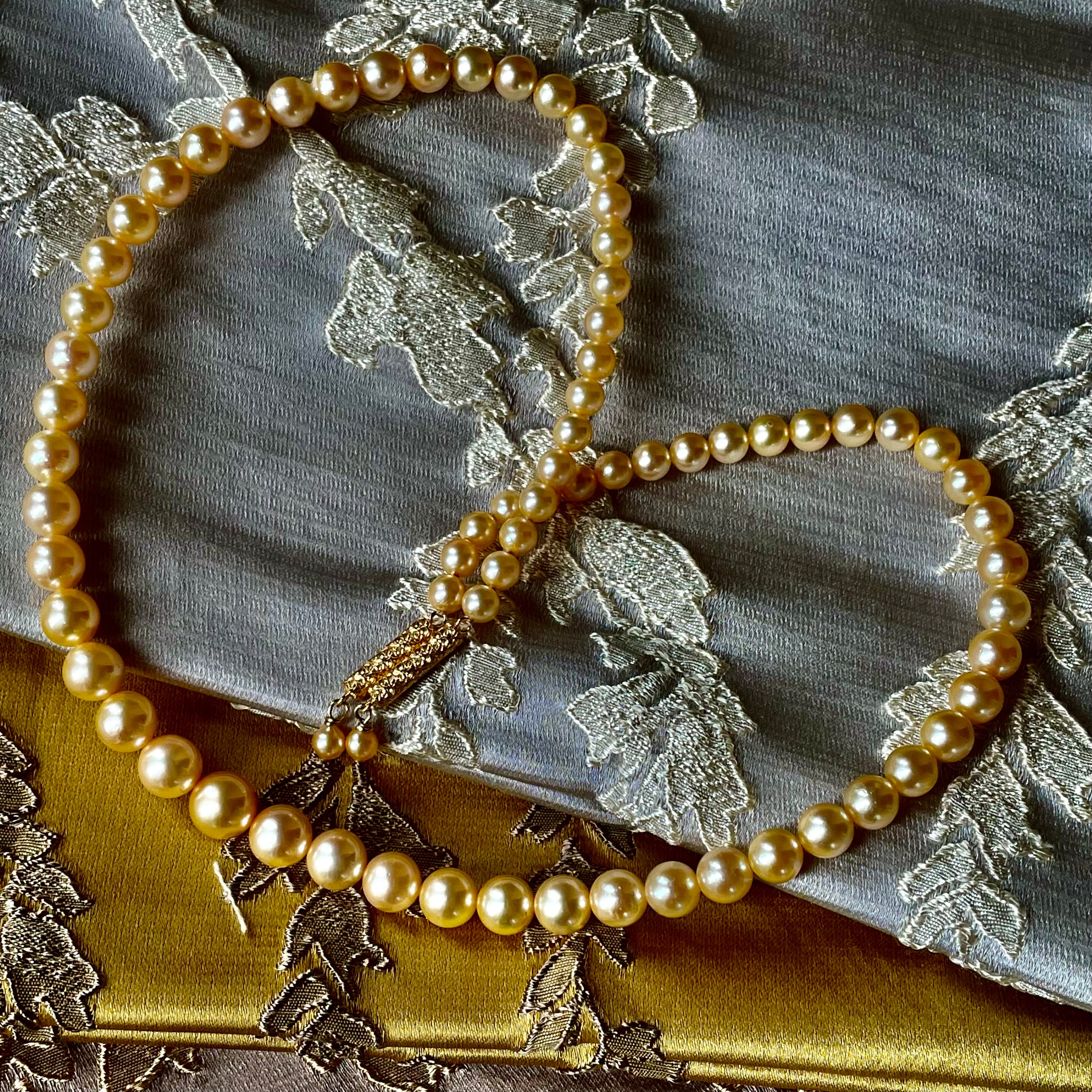 伊勢志摩産の美しいゴールデンピーチのラウンドはなかなか産出されることは少なく良質の色の良いものだけを貯めて何年も時間をかけて組んだ逸品と言え、私も真円でこの大きさと濃さの物に出会ったのは一度だけです。