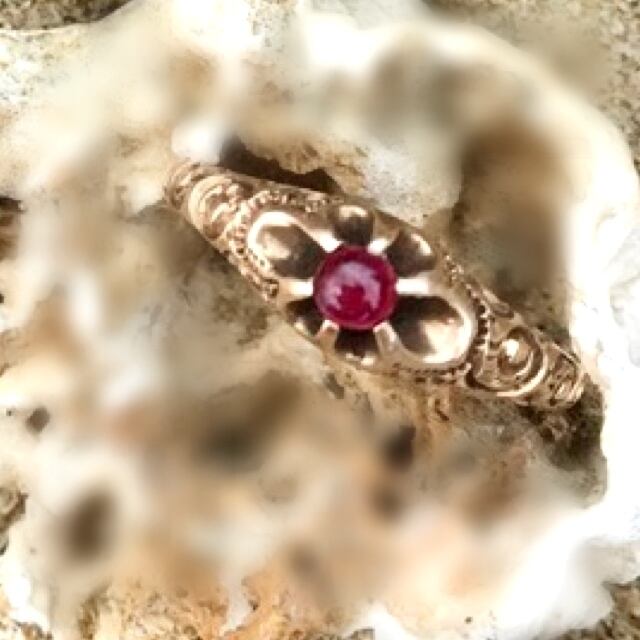 エングレーヴィングの美しい指輪のシャンクに一粒、小さなカボションカットのルビーが留められたリングです。花の形の様なセッティングと美しいエングレービングがシャンクにひと粒留められたラズベリー色のカボションカットのルビーを引き立てます。アンティークならではの少しローズ色のゴールドは日本人に肌なじみが良く身につけやすいリングです。ありそうで無い普段使いにも、コーディネートにちょっと手元に赤い色が欲しい時にもお役立ちのリングです。