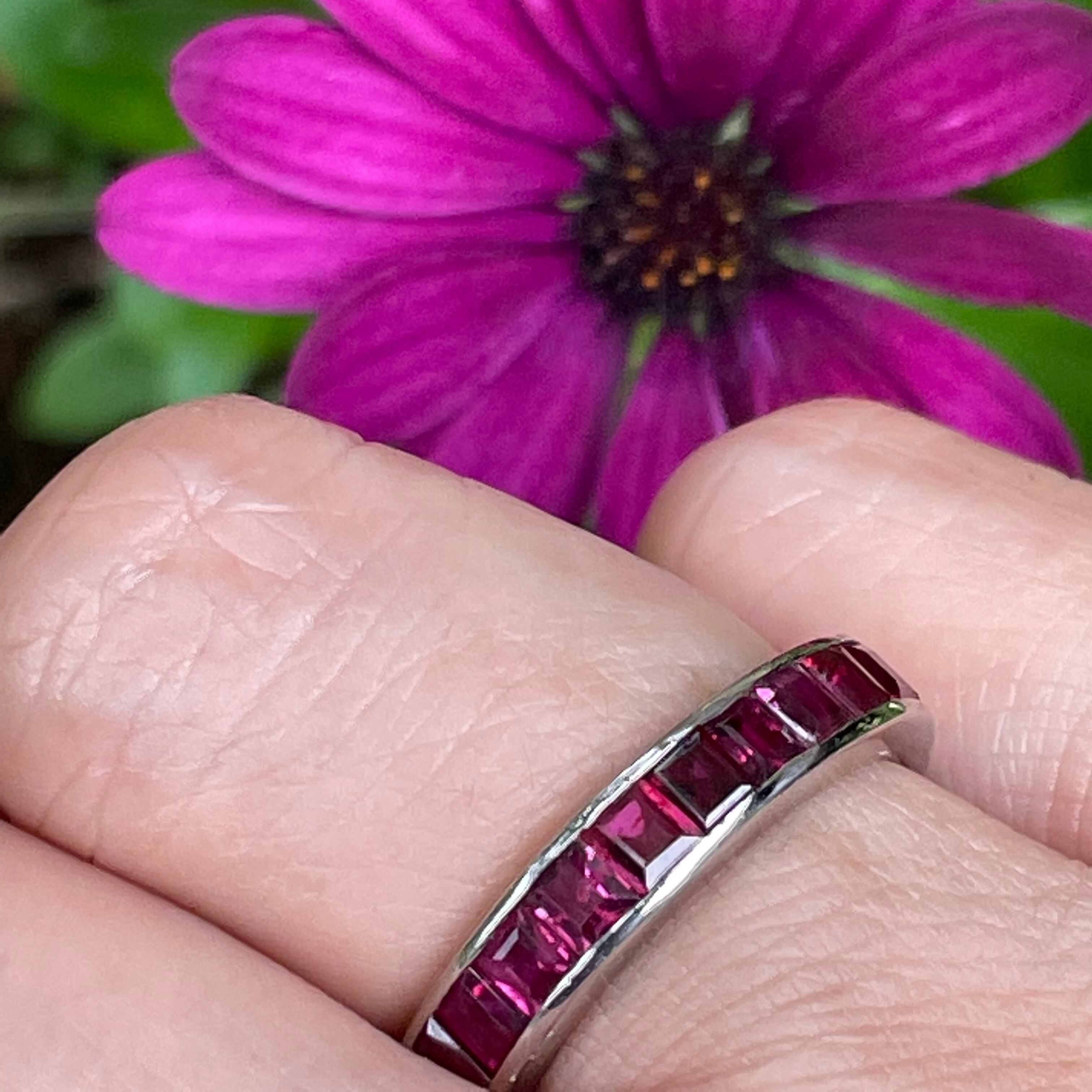 かなり大粒の約4.3ミリ幅の長方形のルビーをみっちりと3.75ctも並べた美しく凛としたエタニティーリングはシンプルながらゴージャス。