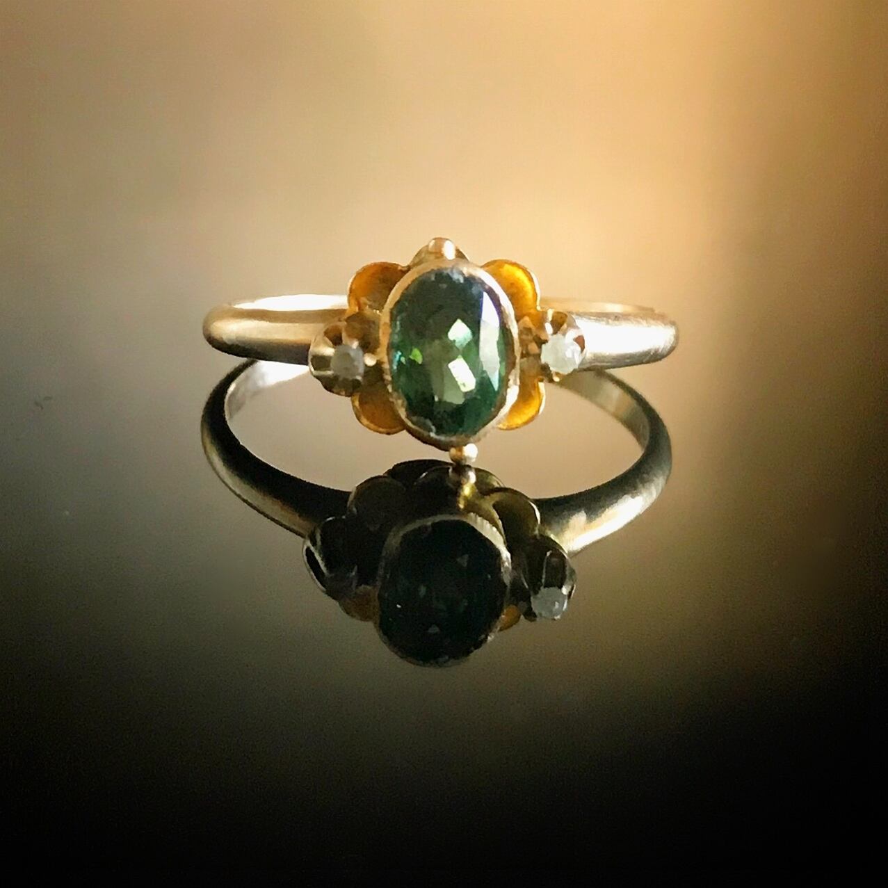 ターンオブザセンチュリーピースと呼ばれる19世紀から20世紀の世紀の変わり目に作られたグリーントルマリンとダイヤモンドのリングです。そのターンオブザセンチュリーピースの中でもこのリングは20世紀の初頭に作られたハンドメイド感とモダンな雰囲気に緑色のトルマリンがぴったりの美しいリングです。