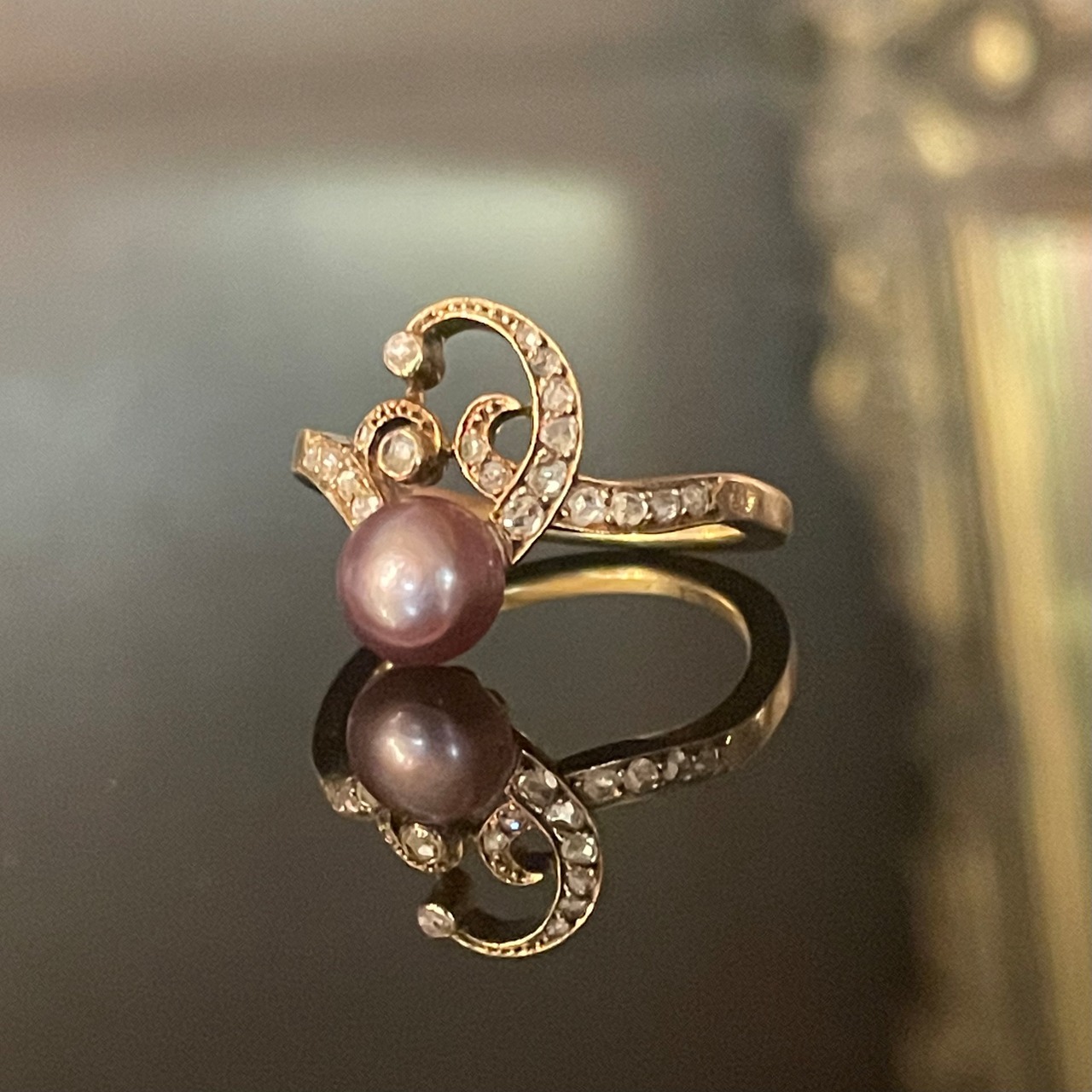 仕事を始めた頃に出会った素敵なニューヨークの女性ディーラーがこの真珠だけはとても特別な色で美しいから売らないの。。。と言われ、買い付けの度に似た様な色に出会うと購入していたのですがここまでテリの良い美しいモーヴカラーの真珠のリングにはそれ以来初めて出会った様な気がします。恐らくですがこの真珠の美しさに感動したデザイナーが作ったのでしょう。1890年から1900年の初頭に製作されたと推定されるデザインですが、当時ダイヤモンドより高価だと言われた希少な天然真珠をメインに、優美なアールヌーボーのローズカットダイヤモンドの曲線が美しくデザインされ着用写真の様に真珠を上にしても下にしてもどちらでも美しいデザインとなっています。モーヴとローズカットダイヤモンドを透かして見えるゴールドは驚くほど相性が良く100年以上前にこの天然真珠の美しさに感動し、リングをデザインしたデザイナーに拍手を贈りたいと思うリングです。
