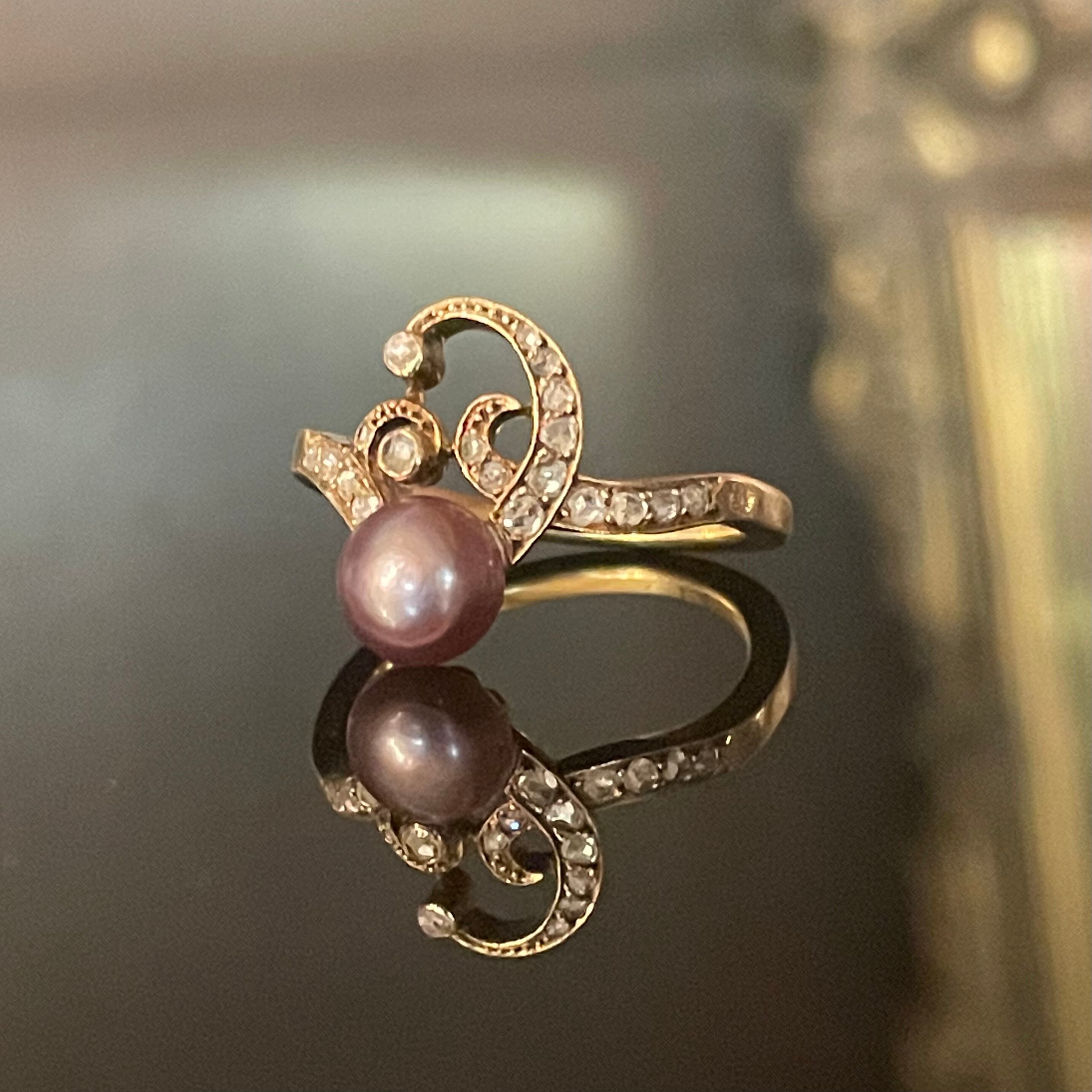 Mauve colour Natural Pearl & Diamond Art Nouveau Ring