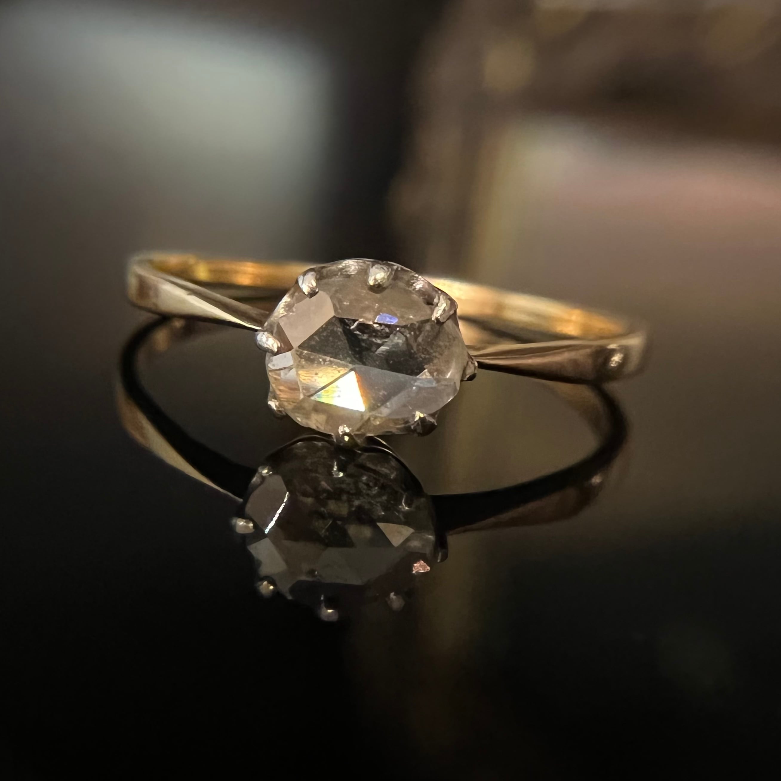シンプルなイエローゴールドで出来ています。サクサクと面を切った様なこのローズカットダイヤモンドのエッジはわざとダイヤモンドの原石のままの状態を磨かずに少し残した本当に古いカットが使われており、拡大をすればインクルージョンはあるものの、非常に透明度も高く身につけた時にこのダイヤモンドの輝きと大きさにときめくリングです。
