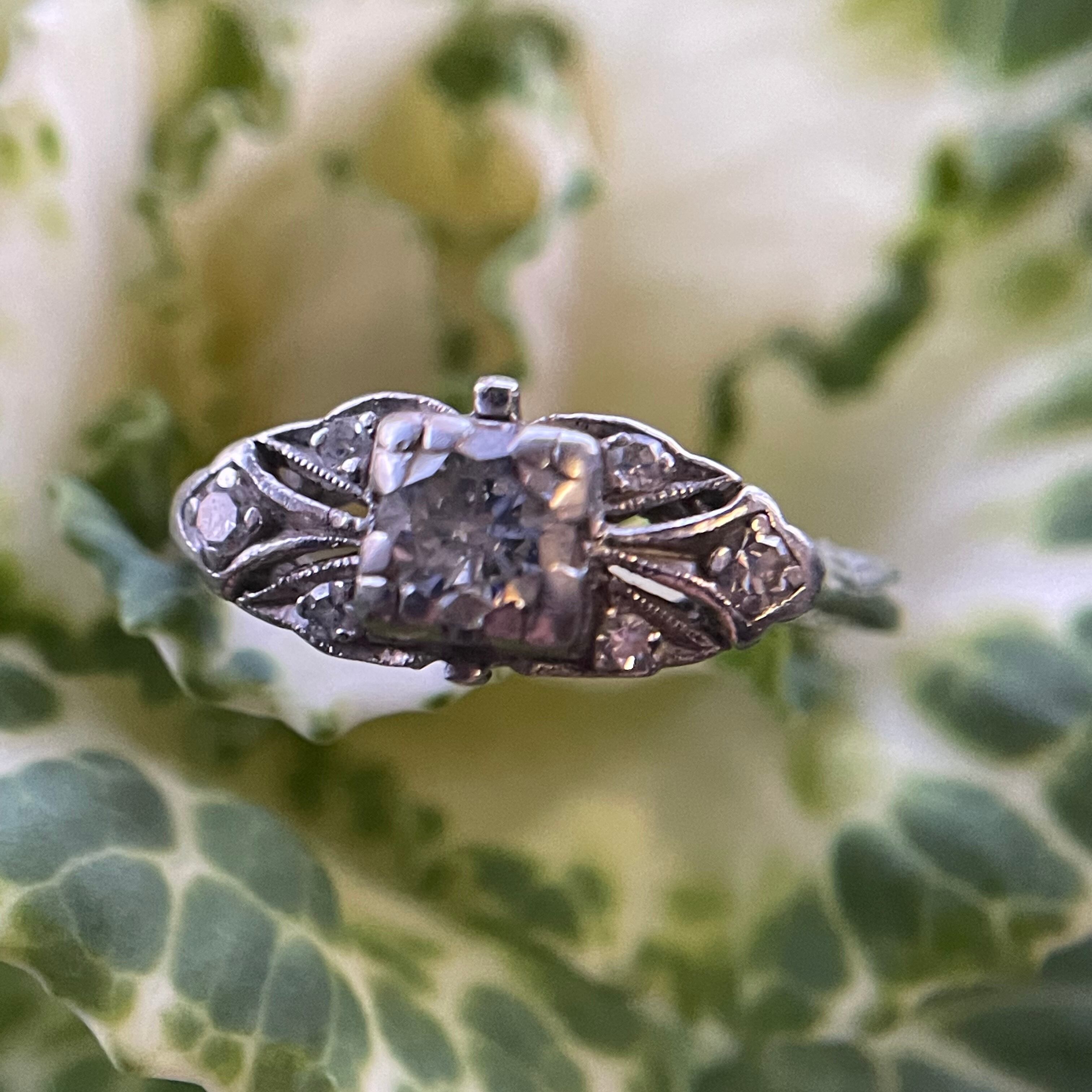 小さいけれどシンプルですっきりとした1930年頃のアールデコ期に作られたダイヤモンドリングです。センターにはオールドカットダイヤモンドが使われて周りの6ピースにはシンプルなシングルカットのダイヤモンドが使われています。